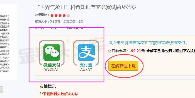 如果你在下载文档时,系统提示您的金币不足,可以采用快捷支付完成付款,毕竟你可能大多数时候只是需要一份文档……