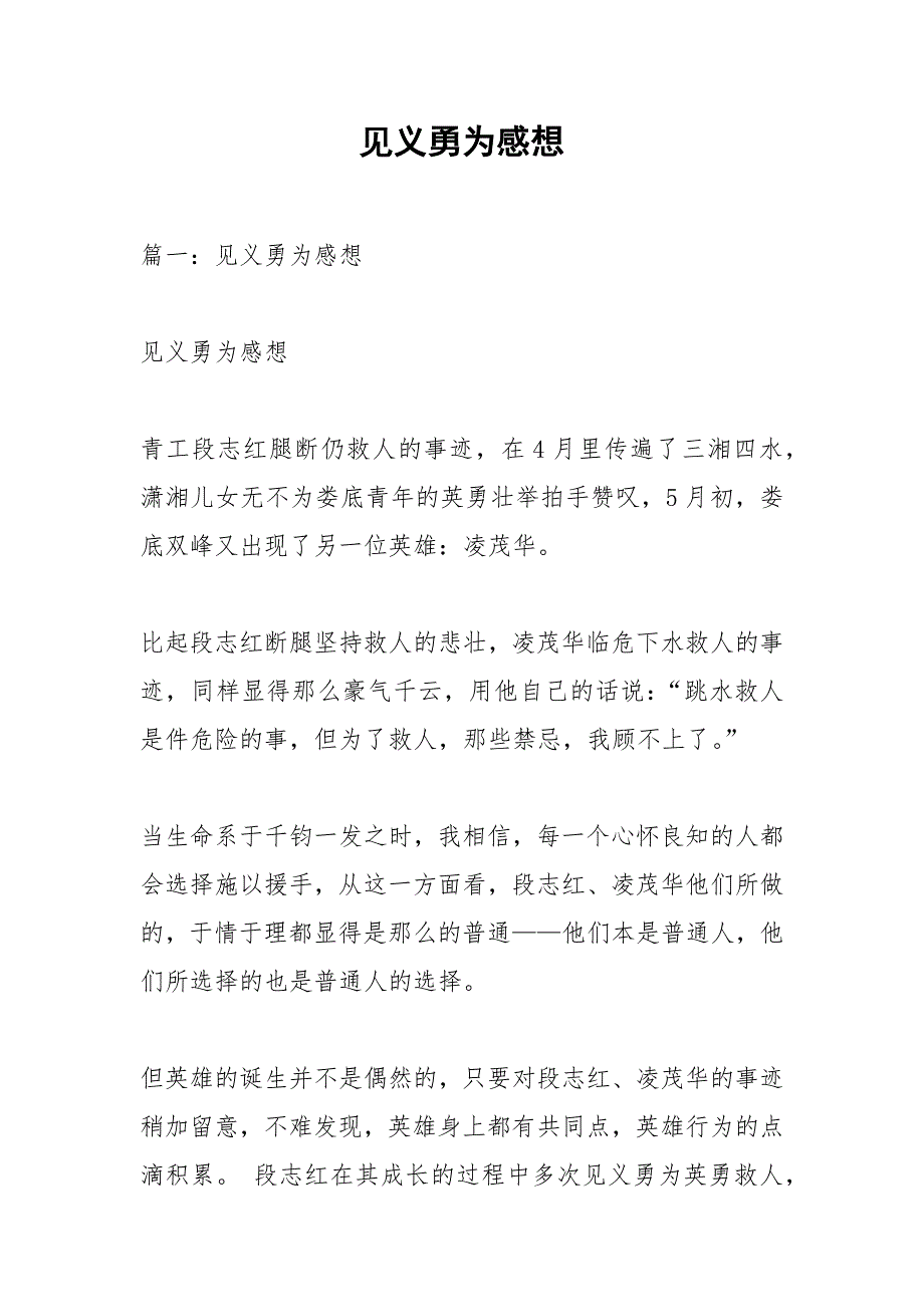 一个人的本质,不仅仅是简单的存在,更应该是一种超越的价值和追求这种精神的信仰,就体现为大义任何.都需要提倡这种大义见义勇为是当前.经久不衰的话题现实中既有象魏青刚似的英雄给人们带来的感动,又有“英雄流血又流泪”事件给人们带来的心痛,还有未成年人盲目见义勇为而献身让人们感动和心痛的同时开始的反思对于这个救人事件,尽管人们依然会质疑大学生们救人方式的科学性和生命价值的对等性,但是,这并不能否定见义勇为作为一个时代命题的价值和意义见义勇为是时代精神的具体体现,是构建.主义和谐.的重要内容正义不是自然而然地降临到我们的生活中的,它需要每一个.成员的竭力维护是一个联合体,只有相互搀扶,相互为善,世界才可以变成一个美好的人间这些大学生为我们树立了典范篇三:见义勇为之感想 见义勇为之感想 有人说越来越多的人在考虑现在当代人思想品德问题越来越多的人在如今的.中越来越迷失自己的方向,理想与现实的差距、前途的迷茫,让越来越多的人陷入了不能摆脱的怪圈总是在说生活没有前进的方向、总是在提如今的人怎么变了,但是当我看见这件震撼人心的见义勇为之后,我突然觉得我们的内心强大的力量从来没有消失过我在扪心自问,如果是我遇见这种情况,我能不能像他们一样,为了更年轻的生命的重生而放弃自己,我心中涌起一阵热热的潮涌,我想我会的!生命的永恒之定格在那一个消失的瞬间了,我们的眼睁睁的看着他们的生命在悄悄的埋没在那无边的江河之中却没有办法将他们挽留住,冰冷的江湖河水在慢慢的冰冷着他们的身体,凛冽的寒风吹的我们的眼眶潮湿而温暖。