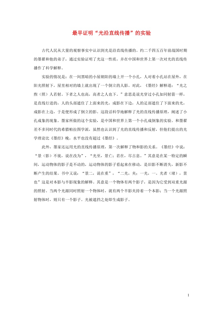 最早证明“光沿直线传播”的实验古代人民从大量的观察事实中认识到光是沿直线传播的约二千四五百年前战国时期的墨翟和他的弟子,通过实验证明了光这一性质,并在中国和世界上第一次对光的直线传播作了科学解释 实验的情况是:在一间黑暗的小屋朝阳的墙上开一个小孔,人对着小孔站在屋外,在阳光照射下,屋里相对的墙上就出现了一个倒立的人影对此,《墨经》解释道:“光之煦(照)人若射下者之人也高,高者之人也下意思是说光穿过小孔如同射箭一样,是直线行进的,人的头部遮住了上面来的光,成影在下边,人的足部遮住了下面来的光,成影在上边,于是便形成了倒立的影这段话科学地解释了光的直线传播原理,阐述了小孔成象的现象墨家所做的这个实验,是中国和世界上第一个小孔成倒象的实验和墨翟差不多同时代的希腊帕拉图学派,虽然也认识到了光的直线传播和反射,但他们提出的光学理论比《墨经》晚,水平也没有超过《墨经》 此外,墨家还运用光的直线传播原理,第一次解释了物和影的关系《墨经》中说:“景(影)不徙,说在改为”,“光至,景亡;若在,尽古息其意是在某一特定的瞬间,运动物体的影子是不动的,运动物体的影子看起来在移动,是旧影不断消失,新影不断产生的结果。
