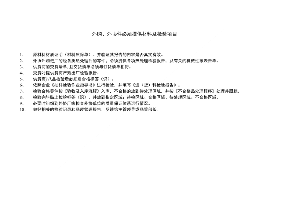 外购、外协件必须提供材料及检验项目1、 原材料材质证明(材料质保单)并验证其报告的内容是否真实有效2、 外协外购进厂的经各类热处理后的零件,必须提供各项热处理检验报告,及有关的机械性报表告单3、 供货商的交货清单,且交货清单必须与订货清单相符4、 交货吋提供货商产殆出厂检验报告5、 供货商j八品检验后必须启合格标签(识)6、 依照企业《抽样检验作业指导书》进行检验,并填写《进(货)料检验报告》7、 检验合格零件按《验收及入库流程》入库,不合格的放到待处理区域,并按《不合格品处理程序》处理并跟踪8、 检验完毕贴上检验标签(识),并放到指定区域:待检区域、合格区域、待处理区域、不合格区域9、 必要时组织到外协厂家检查外协单位的质量保证体系运行情况10、 做好相关的检验记录和品质管理报告,反馈给主管领导或品管部长。