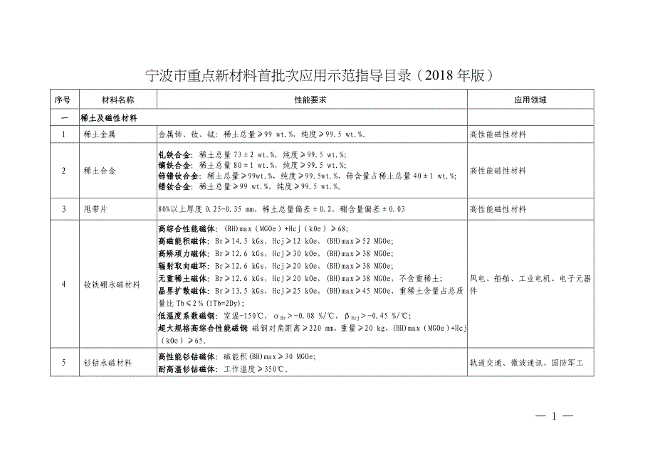 宁波市重点新材料首批次应用示范指导目录(2018年版)序号材料名称性能要求应用领域一稀土及磁性材料1稀土金属金属铈、钕、铽:稀土总量≥99 wt.%,纯度≥99.5 wt.%高性能磁性材料2稀土合金钆铁合金:稀土总量732 wt.%,纯度≥99.5 wt.%;镝铁合金:稀土总量801 wt.%,纯度≥99.5 wt.%;铈镨钕合金:稀土总量≥99wt.%,纯度≥99.5wt.%,铈含量占稀土总量401 wt.%;镨钕合金:稀土总量≥99 wt.%,纯度≥99.5 wt.%高性能磁性材料3甩带片80%以上厚度0.25-0.35 mm,稀土总量偏差0.2,硼含量偏差0.03高性能磁性材料4钕铁硼永磁材料高综合性能磁体:(BH)max(MGOe)+Hcj(k0e)≥68;高磁能积磁体:Br≥14.5 kGs,Hcj≥12 kOe,(BH)max≥52 MGOe;高矫顽力磁体:Br≥12.6 kGs,Hcj≥30 kOe,(BH)max≥38 MGOe;辐射取向磁环:Br≥12.6 kGs,Hcj≥20 kOe,(BH)max≥38 MGOe;无重稀土磁体:Br≥12.6 kGs,Hcj≥20 kOe,(BH)max≥38 MGOe,不含重稀土;晶界扩散磁体:Br≥13.5 kGs,Hcj≥25 kOe,(BH)max≥45 MGOe,重稀土含量占总质量比Tb≤2%(1Tb=2Dy);低温度系数磁钢:室温-150℃,αBr>-0.08 %/℃,βHcj>-0.45 %/℃;超大规格高综合性能磁钢:磁钢对角距离≥220 mm,重量≥20 kg,(BH)max(MGOe)+Hcj(kOe)≥65。