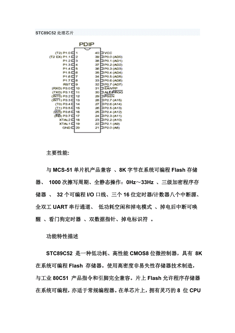STC89C52处理芯片 主要性能: 与MCS-51单片机产品兼容 、8K字节在系统可编程Flash存储器、 1000次擦写周期、全静态操作:0Hz~33Hz 、三级加密程序存储器 、 32个可编程I/O口线、三个16位定时器/计数器八个中断源、全双工UART串行通道、 低功耗空闲和掉电模式 、掉电后中断可唤醒 、看门狗定时器 、双数据指针、掉电标识符 功能特性描述 STC89C52 是一种低功耗、高性能CMOS8位微控制器,具有 8K 在系统可编程Flash 存储器使用高密度非易失性存储器技术制造,与工业80C51 产品指令和引脚完全兼容片上Flash允许程序存储器在系统可编程,亦适于常规编程器在单芯片上,拥有灵巧的8 位CPU 和系统可编程Flash,使得STC89C52为众多嵌入式控制应用系统提供高灵活、超有效的解决方案 STC89C52具有以下标准功能: 8k字节Flash,256字节RAM, 32 位I/O 口线,看门狗定时器,2 个数据指针,三个16 位 定时器/计数器,一个6向量2级中断结构,全双工串行口,片内晶振及时钟电路另外,STC89C52可降至0Hz静态逻辑操作,支持2种软件可选择节电模式。