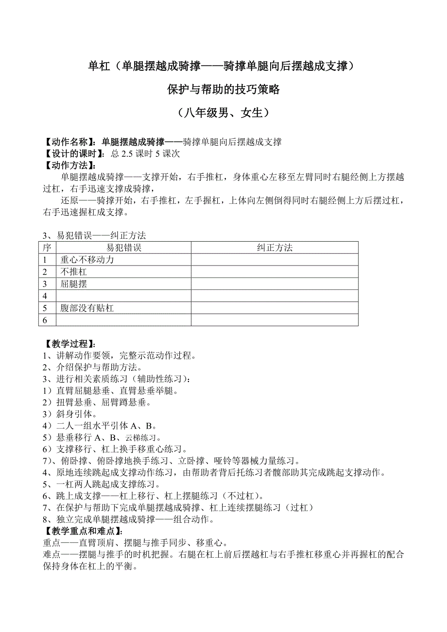 4、原地连续跳起成支撑动作练习,由帮助者背后托练习者髋部助其完成跳起支撑动作 5、一杠两人跳起成支撑练习 6、跳上成支撑——杠上移行、杠上摆腿练习(不过杠) 7、在保护与帮助下完成单腿摆越成骑撑、杠上连续摆腿练习(过杠) 8、独立完成单腿摆越成骑撑——组合动作 【【教学重点和难点教学重点和难点】】: 重点——直臂顶肩、摆腿与推手同步、移重心 难点——摆腿与推手的时机把握右腿在杠上前后摆越杠与右手推杠移重心并再握杠的配合 保持身体在杠上的平衡保护与帮助保护与帮助】】: 单腿摆越成骑撑—— 1、帮助者二人,一位保护者站在练习者支撑臂的杠前一侧,一手扶其支撑手臂,另一手注 意顶住肩另一人站在练习者支撑手的杠前另一侧,当练习者向前摆腿时,支撑臂换手一侧 保护者迅速后移,另一侧保护者扶其支撑手臂,双手顶住练习者上臂助其完成单腿摆越成支 撑 骑撑单腿向后摆越成支撑——同上体验与思考体验与思考 1、如何解决摆腿与推手的时机问题? 2、如何控制摆腿时前冲过大的问题?【【保护与帮助的技巧策略保护与帮助的技巧策略】】:: 对于一般的学生:对于一般的学生:可采用学生间的保护帮助完成练习,即两位保护者分别站于杠两侧,保护、 帮助其完成单腿摆越成骑撑————骑撑单腿向后摆越成支撑动作。