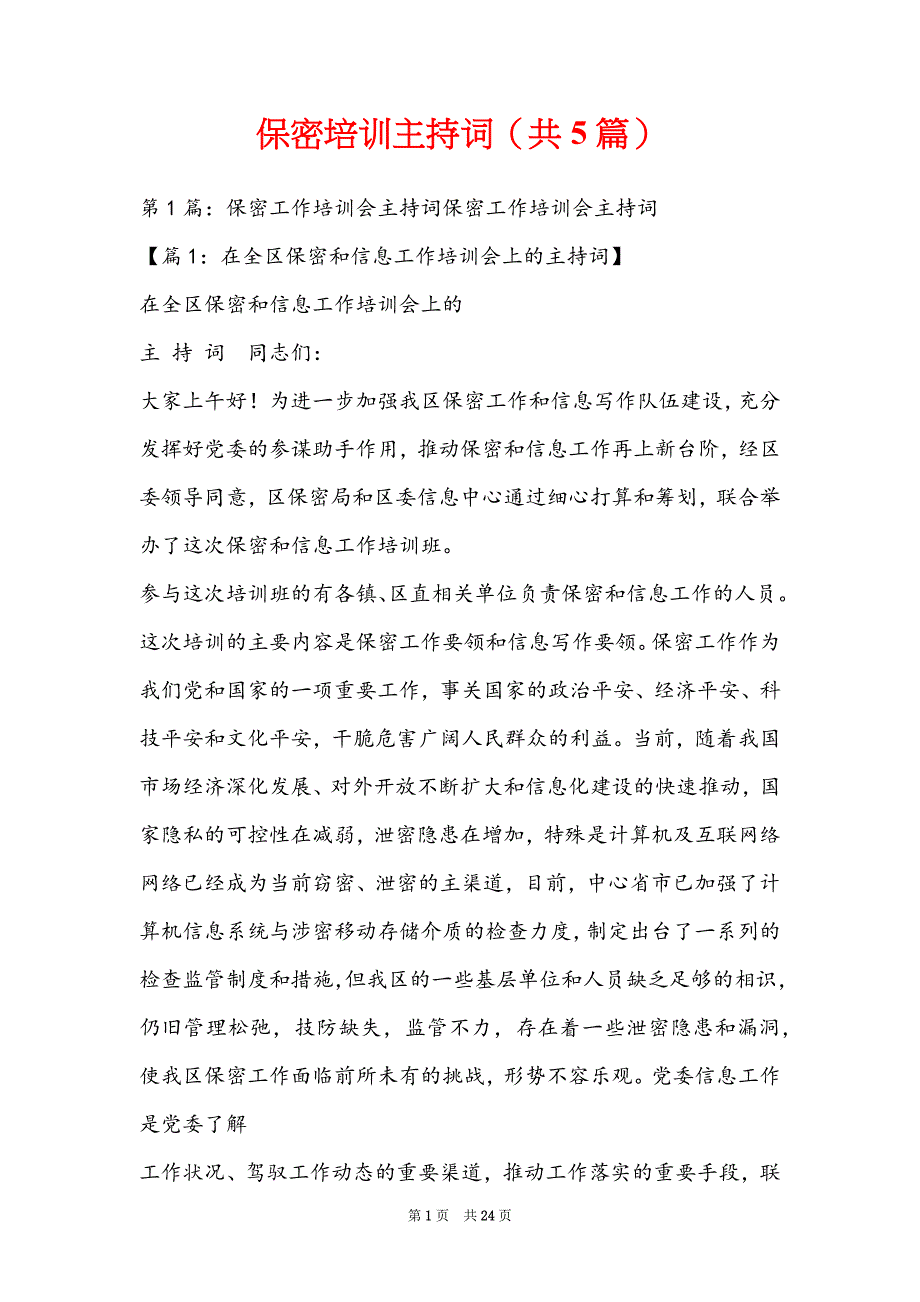 保密培训主持词(共5篇)第1篇:保密工作培训会主持词保密工作培训会主持词【篇1:在全区保密和信息工作培训会上的主持词】在全区保密和信息工作培训会上的主 持 词 同志们:大家上午好!为进一步加强我区保密工作和信息写作队伍建设,充分发挥好党委的参谋助手作用,推动保密和信息工作再上新台阶,经区委领导同意,区保密局和区委信息中心通过细心打算和筹划,联合举办了这次保密和信息工作培训班参与这次培训班的有各镇、区直相关单位负责保密和信息工作的人员这次培训的主要内容是保密工作要领和信息写作要领保密工作作为我们党和国家的一项重要工作,事关国家的政治平安、经济平安、科技平安和文化平安,干脆危害广阔人民群众的利益当前,随着我国市场经济深化发展、对外开放不断扩大和信息化建设的快速推动,国家隐私的可控性在减弱,泄密隐患在增加,特殊是计算机及互联网络网络已经成为当前窃密、泄密的主渠道,目前,中心省市已加强了计算机信息系统与涉密移动存储介质的检查力度,制定出台了一系列的检查监管制度和措施,但我区的一些基层单位和人员缺乏足够的相识,仍旧管理松弛,技防缺失,监管不力,存在着一些泄密隐患和漏洞,使我区保密工作面临前所未有的挑战,形势不容乐观。