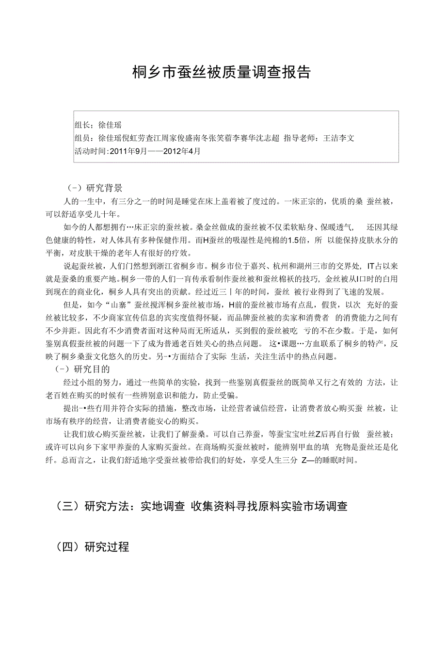 这•课题…方血联系了桐乡的特产,反映了桐乡桑蚕文化悠久的历史另-•方面结合了实际 生活,关注生活中的热点问题研究目的经过小组的努力,通过一些简单的实验,找到一些鉴别真假蚕丝的既简单又行之有效的 方法,让老百姓在购买的时候有一些辨别意识和能力,防止受骗提出-•些冇用并符合实际的措施,整改市场,让经营者诚信经营,让消费者放心购买蚕 丝被,让市场有秩序的经营,让消费者能安心的购买让我们放心购买蚕丝被,让我们了解蚕桑可以自己养蚕,等蚕宝宝吐丝Z后再自行做 蚕丝被;或许可以向乡下家甲养蚕的人家购买蚕丝在商场购买蚕丝被时,能辨别甲血的填 充物是蚕丝还是化纤总而言之,让我们舒适地字受蚕丝被带给我们的好处,享受人生三分 Z—的睡眠时间三)研究方法:实地调查 收集资料寻找原料实验市场调查(四)研究过程活动时间地点2012年2月高桥桐乡蚕 丝城2012年2月高桥2012年4月凤高学校2012年4月凤高学校1 •资料收集整理和讨论,寻找实月2.讨论并制定实验方案3•实地考察,采访相关人员4•总结分析结果,并合理探索参与成员活动形式徐佳瑶,劳査 江,倪虹实地调査调 查蚕丝市场徐佳瑶,倪虹, 劳连江,周家 俊寻找原料全体成员讨论研究计划 制定实验方案全体成员实验验原料一、问卷调査我们小纽成员关于蚕丝被问题出了一份问卷,向市场上的人员进行调查,以下截 取几个有代表性的问题及结果。