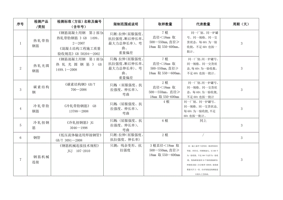 序号检测产品/类别检测标准(方法)名称及编号(含年号)限制范围或说明取样数量代表数量周期(天)1热轧带肋钢筋《钢筋混凝土用钢 第2部分:热轧带肋钢筋 》GB 14992—2007《混凝土结构工程施工质量验收规范》GB 50204—2002只测:拉伸(屈服强度、抗拉强度、断后伸长率、最大力总伸长率)、弯曲、重量偏差7根 直径<18mm 取500—550mm,直径≥18mm 取550-600mm 同一厂别、同一炉罐号、同一规格、同一交货状态,每60t为一验收批,不足60t也按一批计32热轧光圆钢筋《钢筋混凝土用钢 第1部分:热轧光圆钢筋》GB 1499.1—2008只测:拉伸(屈服强度、抗拉强度、断后伸长率、最大力总伸长率)、弯曲、重量偏差7根 直径<18mm 取500-550mm,直径≥18mm 取550—600mm同一厂别、同一炉罐号、同一规格、同一交货状态,每60t为一验收批,不足60t也按一批计33碳素结构钢《碳素结构钢》GB/T 700—2006只测:(屈服强度、抗拉强度、伸长率)、弯曲2根 直径<18mm 取500—550mm,直径≥18mm 取550-600mm同一厂别、同一炉罐号、同一规格、同一交货状态,每60t为一验收批,不足60t也按一批计34冷轧带肋钢筋《冷轧带肋钢筋》 GB 13788—2008只测:(屈服强度、抗拉强度、伸长率)、弯曲 4根同一厂别、同一炉罐号、同一规格、同一交货状态,每60t为一验收批,不足60t也按一批计。
