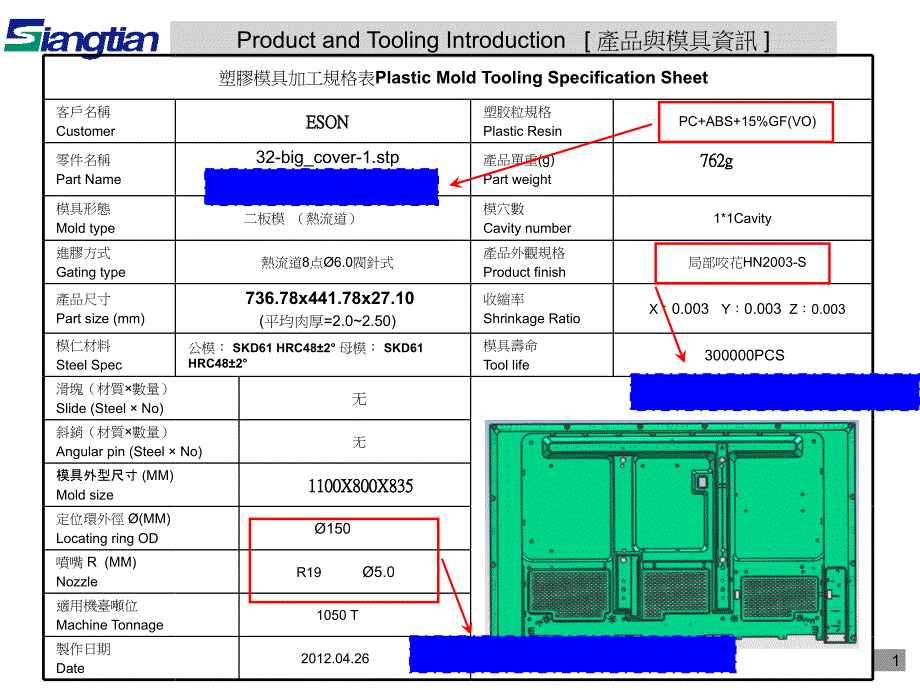 Click to edit Master title style,Click to edit Master text styles,Second level,Third level,Fourth level,Fifth level,*,*,*,Product and Tooling Introduction,產品與模具資訊,1,塑膠模具加工規格表,Plastic Mold Tooling Specification Sheet,客戶名稱,Customer,ESON,塑胶粒規格,Plastic Resin,PC+ABS+15%GF(VO),零件名稱,Part Name,32-,big,_cover-1.stp,32-big_cover-1.stp,產品單重,(,g),Part,weight,762g,模具形態,Mold type,二板模 (熱流道),模穴數,Cavity number,1*1Cavity,進膠方式,Gating,t,ype,熱流道,8,点,6.0,閥針式,產品外觀規格,Product finish,局部咬花,HN2003-S,產品尺寸,Part size(mm),736.78x441.78x27.10,(,平均肉厚,=2.02.50),收縮,率,Shrinkage,Ratio,X,:,0.003,Y,:,0.003,Z,:,0.003,模仁材料,Steel Spec,公模:,SKD61 HRC482,母模:,SKD61 HRC482,模具壽命,Tool life,300000PCS,滑塊(材質,數量),Slide(S,teel,No),无,斜銷(材質,數量),Angular pin,(S,teel,No),无,模具外型尺寸,(MM),Mold,size,1100X800X835,定位環外徑,(MM),Locating ring,OD,150,噴嘴,R,(MM),Nozzle,R19,5.0,適用機臺噸位,Machine Tonnage,1050 T,製作日期,Date,2012.04.26,具体咬花位置和规格待,RD,通知,原料具体规格待,RD,通知,正乙确认与现有机台是否匹配?,2,一、分型线分析,(P/L Line,analysis),CAVITY,紅色線為分型線,請確認!,CORE,CAVITY,CORE,R,角內凹,0.1mm20120512,3,一、分型线分析,(P/L Line,analysis),CAVITY,CORE,CAVITY,CORE,紅色線為分型線,請確認!,4,一、分型线分析,(P/L Line,analysis),CAVITY,CORE,10,紅色線為分型線,請確認!,拔模角度待象田修改产品,3D,后請,RD,確認!,5,一、分型线分析,(P/L Line,analysis),CAVITY,CORE,5,紅色線為分型線,請確認!,5,拔模角度待象田修改产品,3D,后請,RD,確認!,6,一、分型线分析,(P/L Line,analysis),CAVITY,CORE,5,紅色線為分型線,請確認!,5,5,5,拔模角度待象田修改产品,3D,后請,RD,確認!,7,一、分型线分析,(P/L Line,analysis),CAVITY,CORE,紅色線為分型線,請確認!,8,一、分型线分析,(P/L Line,analysis),紅色線為分型線,請確認!,CAVITY,CORE,缺口可否設計與弧形同寬?,9,一、分型线分析,(P/L Line,analysis),紅色線為分型線,請確認!,CAVITY,CORE,PL,線拆平面中間,20120512,10,一、分型线分析,(P/L Line,analysis),紅色線為分型線,請確認!,CAVITY,CORE,PL,線拆平面中間,20120512,11,一、分型线分析,(P/L Line,analysis),紅色線為分型線,請確認!,12,一、分型线分析,(P/L Line,analysis),所有類似孔留公模靠母模,,紅色線為分型線,請確認!,13,一、分型线分析,(P/L Line,analysis),公,模入子,拆線位置,請確認!,母模同樣拆入子,入子線別外提供,20120512,14,一、分型线分析,(P/L Line,analysis),為防止母模,BOSS,粘模,,母模,所有,BOSS,柱孔建議做通孔,方便公模做倒扣(如圖所示),15,一、分型线分析,(P/L Line,analysis),CAV,COR,建議網孔母模,减,膠拔模,7,度公模拔,模,5,度,.,通孔保持不變,請確認,通孔保持不变,16,一、分型线分析,(P/L Line,analysis),母模拆入子,请确认,17,一、分型线分析,(P/L Line,analysis),公模天侧、左右侧同类型,RIB,如右图所示拆入子,请确认,18,一、分型线分析,(P/L Line,analysis),红色线条范围,RIB,如右图所示拆入子,请确认,19,一、分型线分析,(P/L Line,analysis),母模互换入子范围,请确认,20,二、进胶点分析(,Gate analysis,),8,點閥針式熱膠道進膠,進點直徑,6MM,公模,Gate,不可凸,;,G5&G6,公母模均不可凸,;,其余,母模可凸,0.5mm20120512,.,風孔建議封,盲孔,4,排,20120512,21,二、进胶点分析(,Gate analysis,),8,點閥針式熱膠道進膠,進點直徑,6MM,毛邊可凸,0.1mm OK20120512,.,22,三、产品分析(,Product,analysis,),3.00,此三處有倒鉤,倒鉤在母模,建議改公模靠破(如右圖示),R,D,回饋?,23,三、产品分析(,Product,analysis,),3.00,此處有倒鉤,倒鉤在母模,建議改公模靠破(如圖示),R,D,回饋?,24,三、产品分析(,Product,analysis,),此两處有倒鉤,倒鉤在母模,建議改公模靠破(如圖示),6.00,R,D,回饋?,25,三、产品分析(,Product,analysis,),為方便加工公模將拆為三塊,請確認!,R,D,回饋?,PL,毛邊,0.1mm OK20120512,.,26,四、顶出分析(,Ejector structure,analysis,),三邊頂塊,+,內頂塊,+,扁梢,+,圓頂針,,具体以設計組立圖为准,请确认,!,周邊頂塊示意圖,圓頂針,扁梢,頂塊,扁梢取消,改圓頂,.,位置提供,RD0512,毛邊位置,27,五、水路分析(,Cooling,analysis,),所有水路直径为,10mm,母模水路,具体以設計組立圖为准,请确认,!,A#1 IN,A#1 OUT,A#2 OUT,A#2 IN,A#3 OUT,A#3 IN,A#4 OUT,A#4 IN,A#5 IN,A#5 OUT,A#6 OUT,A#6 IN,A#7 OUT,A#7 IN,A#8 OUT,A#8 IN,A#9 IN,A#9 OUT,A#10 OUT,A#10 IN,A#11 IN,A#11 OUT,A#12 OUT,A#12 IN,A#13 IN,A#13 OUT,28,五、水路分析(,Cooling,analysis,),所有水路直径为,10mm,公模水路,具体以設計組立圖为准,请确认,!,B#1 IN,B#1 OUT,B#2 OUT,B#2 IN,B#3 OUT,B#3 IN,B#4 OUT,B#4 IN,B#5 IN,B#5 OUT,B#6 OUT,B#6 IN,B#7 OUT,B#7 IN,B#8 OUT,B#8 IN,B#9 OUT,B#9 IN,B#10 OUT,B#10 IN,B#11 OUT,B#11 IN,B#12 OUT,B#12 IN,29,六、拔模分析(,draft analysis),绿色所示,RIB,未拔模,建議大端,做,0.9MM,小端做,0.7MM,请确认,30,六、拔模分析(,draft analysis),请确认,绿色所示,RIB,未拔模,建議大端,做,0.9MM,小端做,0.7MM,31,六、拔模分析(,draft analysis),请确认,绿色所示,RIB,未拔模,建議大端,做,0.9MM,小端做,0.7MM,32,六、拔模分析(,draft analysis),请确认,成品地侧未拔模,建議往母模方向减肉拔模,5,度,33,六、拔模分析(,draft analysis),所有,BOSS,侧壁加肉拔模,单边增肉,0.15mm,,请确认,提供,3D,給,RD,確認,34,六、拔模分析(,draft analysis),单边减肉拔模,1,度,请确认,35,谢谢观看,/,欢迎下载,BY FAITH I MEAN A VISION OF GOOD ONE CHERISHES AND THE ENTHUSIASM THAT PUSHES ONE TO SEEK ITS FULFILLMENT REGARDLESS OF OBSTACLES.BY FAITH I BY FAITH,内容总结,1。