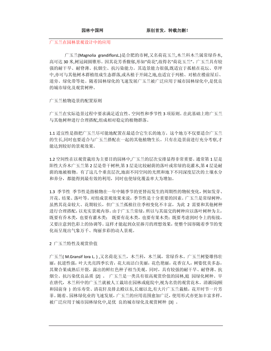 焦山公园的广玉兰园中放置了一些具有一定观价值的太湖石,并在上面刻有诗词、楹联,人 们穿行其中,观树赏石, 意趣无穷 3.4 道路绿化中的应用 广玉兰树姿优雅,四季常青,病虫害少,因而是优良的行道树种, 不仅可以在夏日为行人提 供必要的庇萌,还能很好地美化街景但藏种时应尽量选择较大 一些的苗木,干径 3 厘米~6 厘米,高度 2.8 米左右较为适宜过小,用易遗破坏,过大, 则移栽成活率低5 年生之后的广玉兰生长开始转快,1 0 年以后生长嗣更快 年商生长可 这 0.6 米上现大多高 8 米以上,冠幅达 4 米 4 米以上胸径达 15 厘米以上且树冠丰满 圆整道路绿化时,广玉兰与色叶树种(如五角枫、乌柏、吝等) 配檀,舶产生显著的色相 对比,从而使衡景的色彩更显鲜艳和丰富 3.5 公共绿地中的应用 在面积较大绿地中,广玉兰可以孤植挺立于草坪、花坛中及园路转 弯或交叉路口,让人欣赏其雄伟壮丽的姿态、硕大莹洁的花朵和闻其浓郁的芳香广玉兰可 以群植于开阔的草坪上 让人欣赏其林立挺拔的树干, 伸展饱满的树冠以及朵朵浮立于树冠 之上的大型花朵给人以恬静的美感 4 在园林绿化中应注意的问题 广玉兰是园林造景艺术中广泛运用的植物材料, 园林绿化应根据自己的条件, 因地制宜地使 用广玉兰,否则会带来景观的不协调。