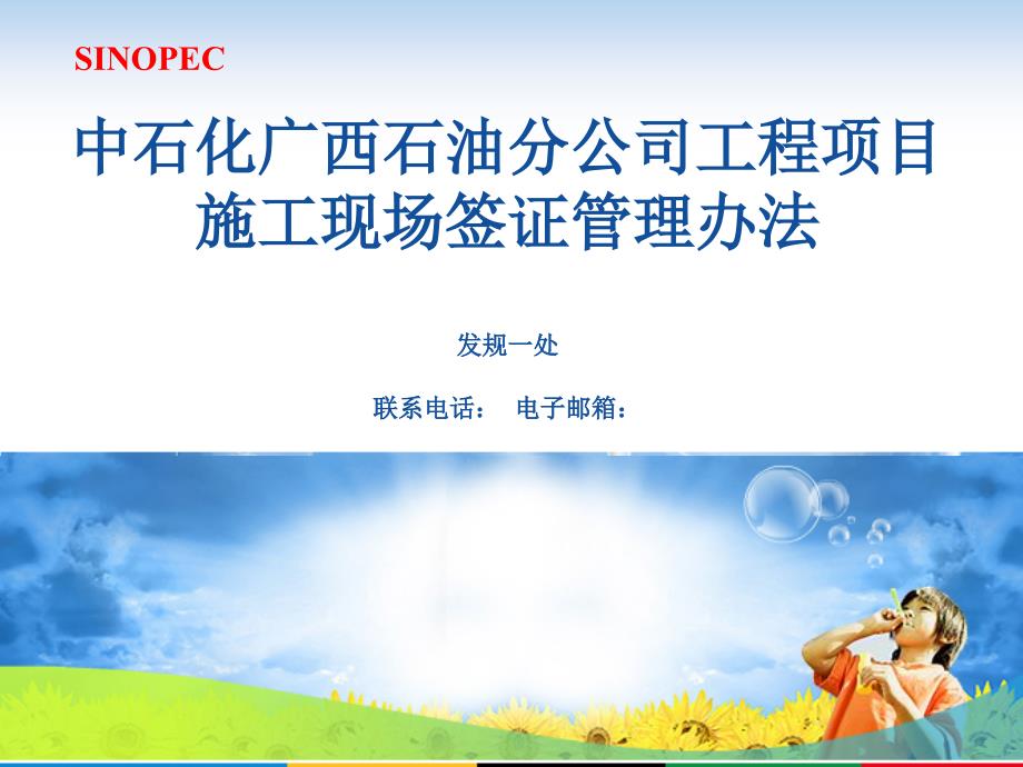 SINOPEC中石化广西石油分公司工程项目 施工现场签证管理办法发规一处 联系: 电子邮箱:SINOPEC总则 签证内容要求 签证依据四二三目 录一签证审核程序 SINOPEC签证审核期限 签证审核意见 签证权限 八六七目 录五签证结算方式 签证人员管理 九SINOPEC一.总 则 目的n加强基建施工现场签证管理n明确签证经办人员的职责 n有效控制工程造价 n避免无序施工 SINOPEC一.总 则 签证对象n有明确的工程指令,但需根据现场实际情况确定实施范围、程度、 数量及价格上限的工作; n根据施工现场实际情况,与施工图纸不符但实际在施工过程中必须实施的工作; n由于我司自身或不可抗拒力的原因,造成工期延长而产生的工期签证;n根据施工合同或招标文件的约定,需要进行的工程签证; SINOPEC二.签证内容要求 2.1 工程签证单、签证原始记录及所有影响工程签证的文件必 须由区公司授权指定的签证管理人员按权限签字确认后方为有 效 2.2 签证单应注明合同编号并与“工程签证执行指令登记册”的 编号一致签证表格按区公司发展基建处统一制定的表格进行 填写SINOPEC二.签证内容要求 附件:附表一:变更工程签证执行指令登记册附表二:新增工程签证执行指令登记册附表三:工程签证单SINOPEC附表一:变更工程签证执行指令登记册工程名称:项目批文号及批准金额:合同价格:合同编号:签证指令编号签证理由及内容原项目价格变更工程 签证上控 价格签证权限最终审批人签证指令 发出时间备注NN根据各分公司 实际情况进行 编号准确描述由谁、什么时候、因 什么原因、提出将何种工作做 何变更的签证要求。