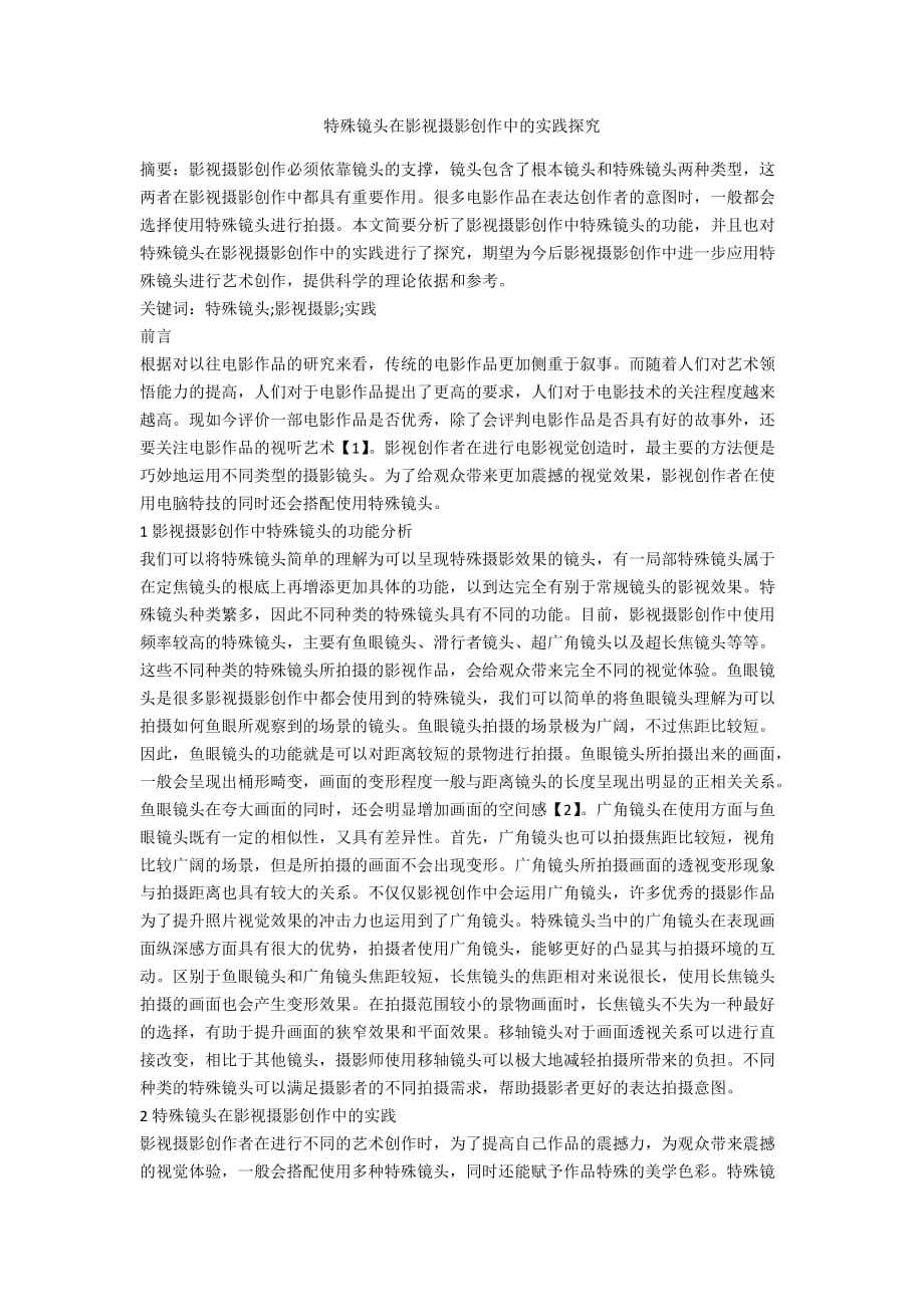 特殊镜头在影视摄影创作中的实践探究 摘要:影视摄影创作必须依靠镜头的支撑,镜头包含了根本镜头和特殊镜头两种类型,这两者在影视摄影创作中都具有重要作用很多电影作品在表达创作者的意图时,一般都会选择使用特殊镜头进行拍摄本文简要分析了影视摄影创作中特殊镜头的功能,并且也对特殊镜头在影视摄影创作中的实践进行了探究,期望为今后影视摄影创作中进一步应用特殊镜头进行艺术创作,提供科学的理论依据和参考关键词:特殊镜头;影视摄影;实践前言根据对以往电影作品的研究来看,传统的电影作品更加侧重于叙事而随着人们对艺术领悟能力的提高,人们对于电影作品提出了更高的要求,人们对于电影技术的关注程度越来越高现如今评价一部电影作品是否优秀,除了会评判电影作品是否具有好的故事外,还要关注电影作品的视听艺术【1】影视创作者在进行电影视觉创造时,最主要的方法便是巧妙地运用不同类型的摄影镜头为了给观众带来更加震撼的视觉效果,影视创作者在使用电脑特技的同时还会搭配使用特殊镜头1影视摄影创作中特殊镜头的功能分析我们可以将特殊镜头简单的理解为可以呈现特殊摄影效果的镜头,有一局部特殊镜头属于在定焦镜头的根底上再增添更加具体的功能,以到达完全有别于常规镜头的影视效果。