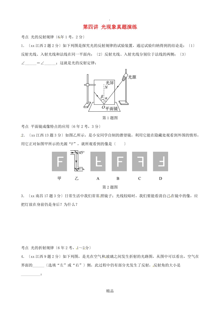 第四讲 光现象真题演练考点 光的反射规律〔6年1考,2分〕1.〔xx江西2题2分〕如下列图是探究光的反射规律的试验装置,通过试验归纳得到的结论是:〔1〕反射光线、入射光线和法线在同一平面内;〔2〕反射光线、入射光线分别位于法线的两侧;〔3〕∠______=∠______;这就是光的反射定律;第1题图考点 平面镜成像特点的应用〔6年2考,3分〕2.〔xx江西13题3分〕如图乙所示,是小安同学自制的潜望镜,利用它能在隐藏处观看到外围的情形,用它正对如图甲所示的光源“F”,就所观看到的像是〔 〕第2题图3.〔xx南昌17题3分〕日常生活中我们常常照镜子;光线较暗时,我们要能看清自己在镜中的像,应把灯放在身前仍是身后?为什么?考点 光的折射规律〔6年2考,1~2分〕4.〔xx江西9题2分〕如下列图,是光在空气和玻璃之间发生折射的光路图,从图中可以看出,空气在界面的______〔选填“左”或“右”〕侧,此过程中仍有部分光发生了反射,反射角的大小是__________;精品.第4题图考点 探究平面镜成像特点〔6年1考,4分〕5.[xx江西23〔1〕题4分]玲玲同学进行试验时,挑选两根完全相同的蜡烛、一块较厚的玻璃板M〔P、Q两个面都可以作为平面镜使用〕【进行试验与收集证据】她在桌面上铺一张大纸,直立一块玻璃板;将蜡烛A放置在玻璃板的前面,点燃蜡烛A,然后将蜡烛B放置在玻璃板后面,如图甲所示,进行试验;玲玲依据图乙中的测量方法,多次转变蜡烛A的位置,仔细测量并记录了对应数据:第5题图试验序号1234物距u/cm4.25.06.810.0像距v/cm3.74.56.39.5【分析与论证】依据上述试验数据分析得出:像距小于物距;【沟通与评估】这个结论与平面镜成像特点不相符,主要是挑选了蜡烛A所成的像到反射面的距离__________〔选填“正确”或“不正确”〕;依据上面数据推算玻璃板的厚度为__________cm;精品.参考答案1.β α2.B3.答:我们要能看清自己在镜中的像,应把灯放在身前;由于要观察自己是有光照耀到自己身上,发生漫反射,再经过镜面反射进入人的眼睛,人才能看清自己,所以应将光源放在前面;4.左 605.【沟通与评估】不正确 0.5如有侵权请联系告知删除,感谢你们的协作!精品。