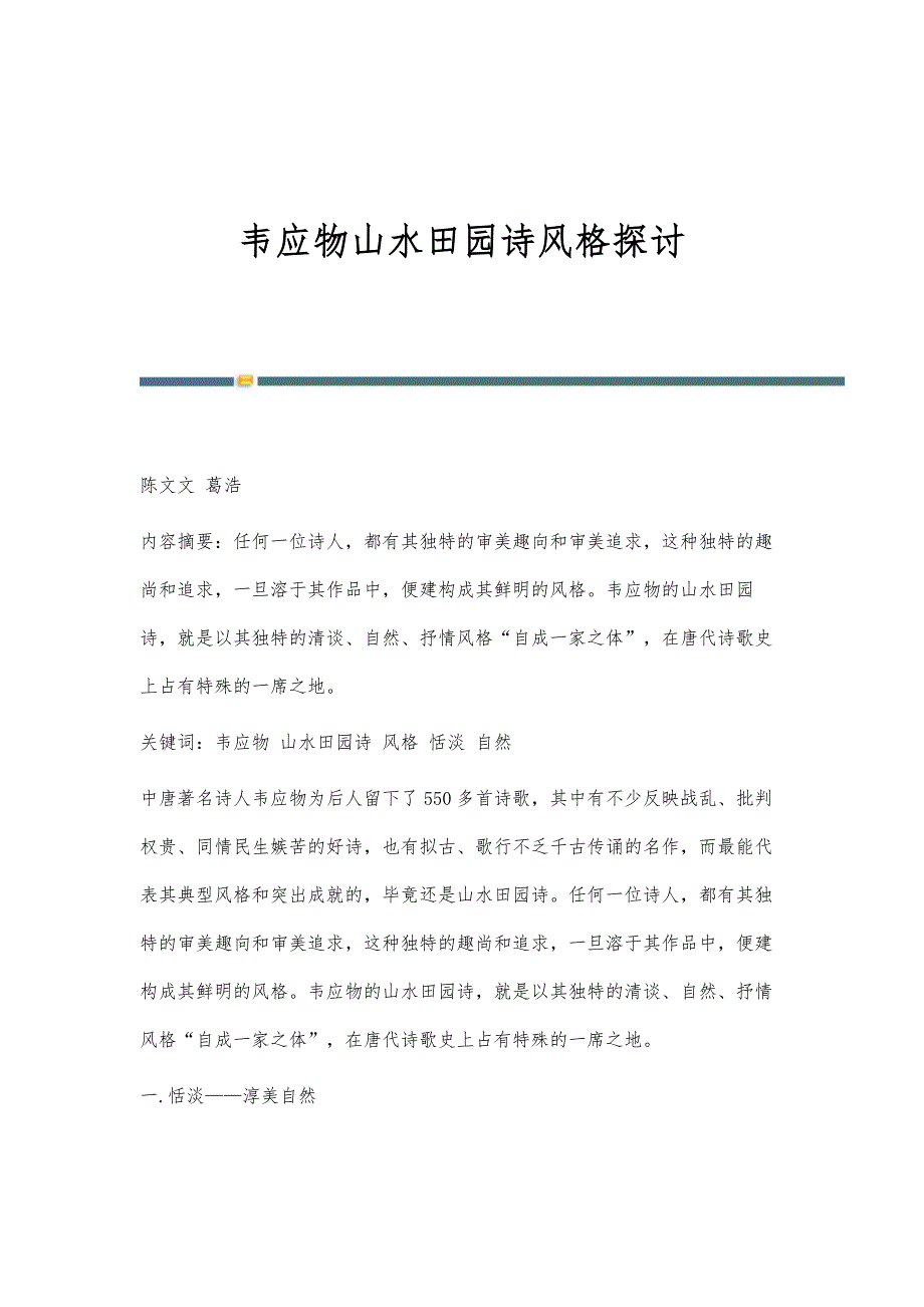 韦应物山水田园诗风格探讨 陈文文 葛浩内容摘要:任何一位诗人,都有其独特的审美趣向和审美追求,这种独特的趣尚和追求,一旦溶于其作品中,便建构成其鲜明的风格韦应物的山水田园诗,就是以其独特的清谈、自然、抒情风格“自成一家之体”,在唐代诗歌史上占有特殊的一席之地关键词:韦应物 山水田园诗 风格 恬淡 自然中唐著名诗人韦应物为后人留下了550多首诗歌,其中有不少反映战乱、批判权贵、同情民生嫉苦的好诗,也有拟古、歌行不乏千古传诵的名作,而最能代表其典型风格和突出成就的,毕竟还是山水田园诗任何一位诗人,都有其独特的审美趣向和审美追求,这种独特的趣尚和追求,一旦溶于其作品中,便建构成其鲜明的风格韦应物的山水田园诗,就是以其独特的清谈、自然、抒情风格“自成一家之体”,在唐代诗歌史上占有特殊的一席之地一.恬淡——淳美自然韦应物一生由豪侠公子走向文人学士,由三卫郎做到大州刺史,做官虽不算显达,然官运尚可,总是缓步升迁的,自无迁谪之怨;他做官勤慎爱民,以清廉直正见称,加之生性恬淡,自无躁进之心,更不会刻剥人民而取宠;他对当时社会前景缺乏足够的希望和信心,隐退思想时隐时显诗如其人,因此,他的诗在古朴隐淡之中,描绘了一幅幅色彩淡淡的图画,表现了诗人淳美的自然情操。