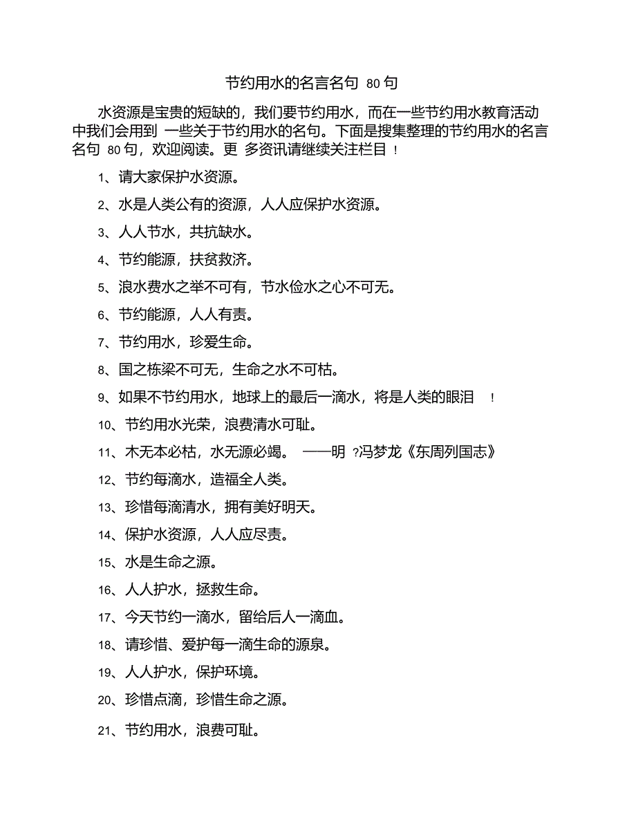节约用水的名言名句 80 句水资源是宝贵的短缺的,我们要节约用水,而在一些节约用水教育活动中我们会用到 一些关于节约用水的名句下面是搜集整理的节约用水的名言名句 80 句,欢迎阅读更 多资讯请继续关注栏目 !1、请大家保护水资源2、水是人类公有的资源,人人应保护水资源3、人人节水,共抗缺水4、节约能源,扶贫救济5、浪水费水之举不可有,节水俭水之心不可无6、节约能源,人人有责7、节约用水,珍爱生命8、国之栋梁不可无,生命之水不可枯9、如果不节约用水,地球上的最后一滴水,将是人类的眼泪 !10、节约用水光荣,浪费清水可耻11、木无本必枯,水无源必竭 ——明 ?冯梦龙《东周列国志》12、节约每滴水,造福全人类13、珍惜每滴清水,拥有美好明天14、保护水资源,人人应尽责15、水是生命之源16、人人护水,拯救生命17、今天节约一滴水,留给后人一滴血18、请珍惜、爱护每一滴生命的源泉19、人人护水,保护环境20、珍惜点滴,珍惜生命之源21、节约用水,浪费可耻22、龙头打开水哗哗,转身莫忘关掉它23、请动一下手,关好水龙头24、一周无水,人则虚 ;一年无水,则国损 ;百年无水,将如何 ?25、水是生命之源,请珍惜每一滴水。