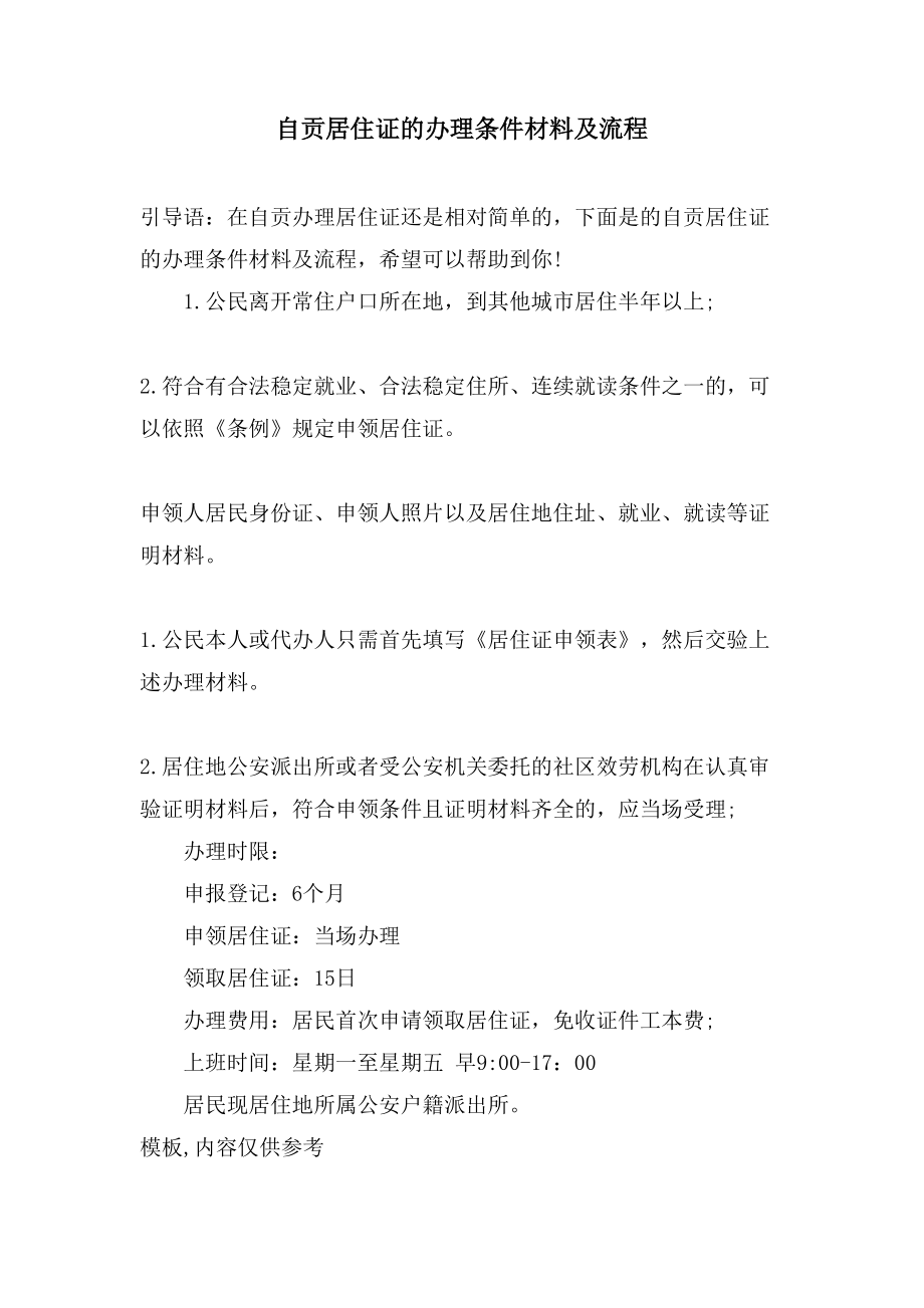 自贡居住证的办理条件材料及流程 引导语:在自贡办理居住证还是相对简单的,下面是的自贡居住证的办理条件材料及流程,希望可以帮助到你! 1.公民离开常住户口所在地,到其他城市居住半年以上; 2.符合有合法稳定就业、合法稳定住所、连续就读条件之一的,可以依照《条例》规定申领居住证 申领人居民身份证、申领人照片以及居住地住址、就业、就读等证明材料 1.公民本人或代办人只需首先填写《居住证申领表》,然后交验上述办理材料 2.居住地公安派出所或者受公安机关委托的社区效劳机构在认真审验证明材料后,符合申领条件且证明材料齐全的,应当场受理; 办理时限: 申报登记:6个月 申领居住证:当场办理 领取居住证:15日 办理费用:居民首次申请领取居住证,免收证件工本费; 上班时间:星期一至星期五 早9:00-17:00 居民现居住地所属公安户籍派出所 模板,内容仅供参考 。