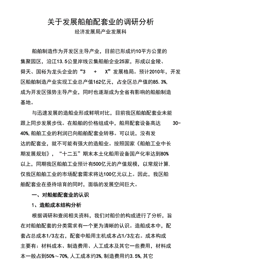 关于发展船舶配套业的调研分析经济发展局产业发展科船舶制造作为开发区主导产业,目前已形成约10平方公里的 集聚园区,沿江13.5公里岸线云集船舶企业25家,形成以金陵、 舜天、国裕为龙头企业的“3 + X”发展格局预计2010年,开发 区船舶制造产业实现工业总产值162亿元,占全区总产值的85.3%, 成为开发区强势主导产业,同时也逐渐成为全省有影响的船舶制造 基地与迅速发展的造船业形成鲜明对比,目前我区船舶配套业未能 跟上同步发展步伐在船舶的价格组成中,船用配套设备高达 30-40%,船舶工业的利润已向船舶配套业转移可以说,没有发 达的配套业,就不可能有强大的造船业按照国家《船舶工业中长 期发展规划》,“十二五”期末本土化船用设备国产化率达到80% 以上,同期我区船舶工业预计有500亿元的产值规模,以常规计算, 仅我区船舶工业的市场配套需求将达100亿元以上因此,我区船 舶配套业在亟待培育的同时,面临的发展空间巨大一、对船舶配套业的认识1、造船成本结构分析根据调研和查阅相关资料,我们对船价的构成进行了分析,旨 在对船舶配套的分类需求有一个更为清晰的认识造船成本中,配 套占总成本1/3左右,配套中船用主机成本占1/3左右。
