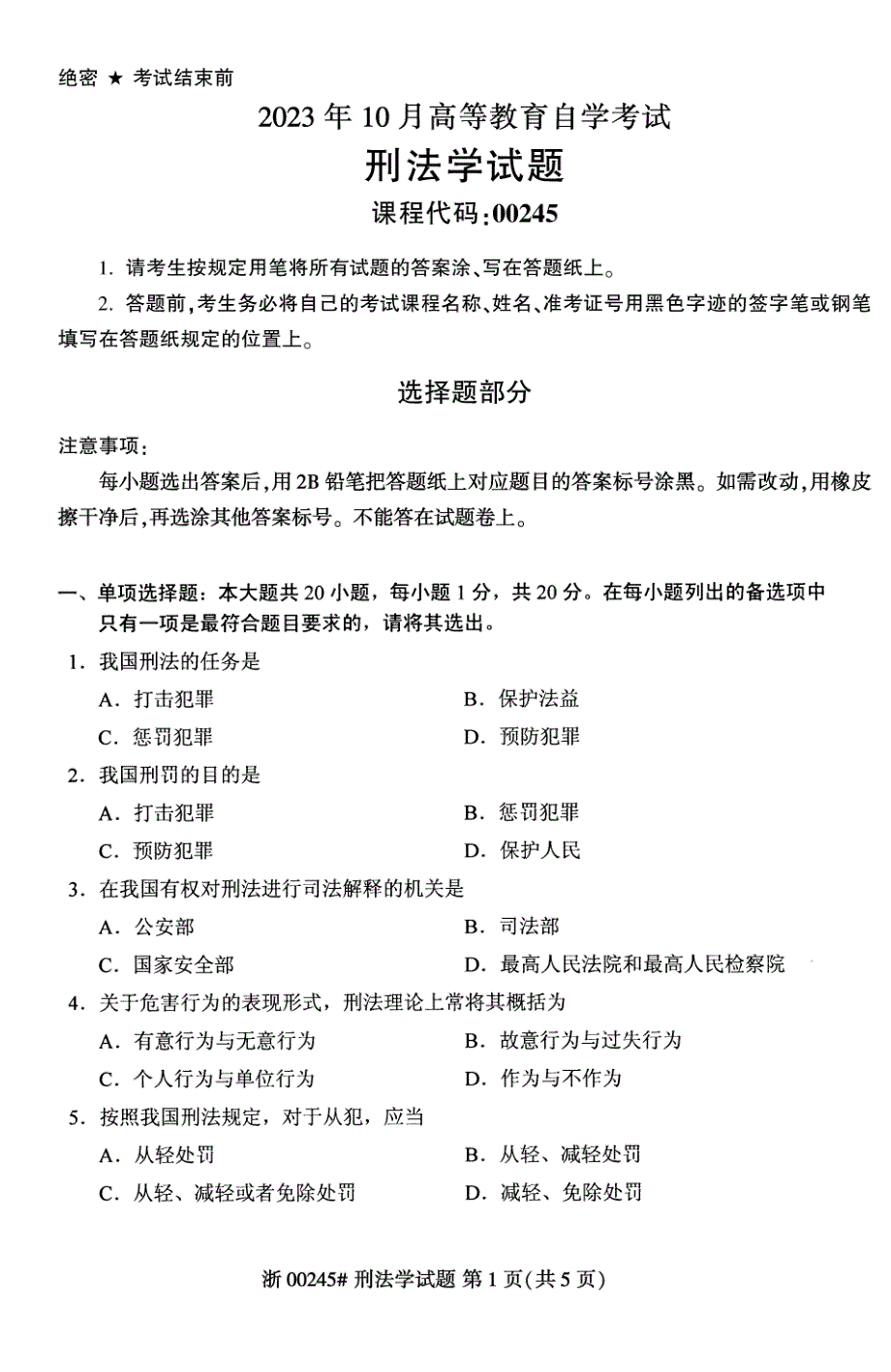 绝密启用前 2023年10月高等教育自学考试全国统一命题考试 刑法学试题答案及评分参考 刑法学试题答案及评分参考(课程代码 00245)一、单项选择题:本大题共 20 小题,每小题 1 分,共 20 分1B 2C 3D 4D 5C 6C 7B 8A 9B 10A 11C 12B 13A 14D 15A 16A 17A 18C 19B 20D 二、多项选择题:本大题共 5 小题,每小题 2 分,共 10 分21CDE 22ABCDE 23ABC 24BCD 25BCDE 三、名词解释题:本大题共 4 小题,每小题 3 分,共 12 分评分参考】(1)考生作答所用词语、句式、前后顺序与答案不同,只要意思正确,就应给分2)考生要点回答不完整,也应酌情给分26数罪并罚是指人民法院对一人犯数罪分别定罪量刑,并根据法定原则和方法,决定应当执行的刑罚3 分)27即成犯是指一旦发生法益侵害结果,犯罪便同时终了,犯罪一终了法益就同时消灭的情况3 分)28类推解释是指需要判断的具体事实与法律规定的构成要件基本相似时,将后者的法律效果适用于前者3 分)29逃汇罪是指公司、企业或者其他单位,违反国家规定,擅自将外汇存放境外,或者将境内的外汇非法转移到境外,数额较大的行为。