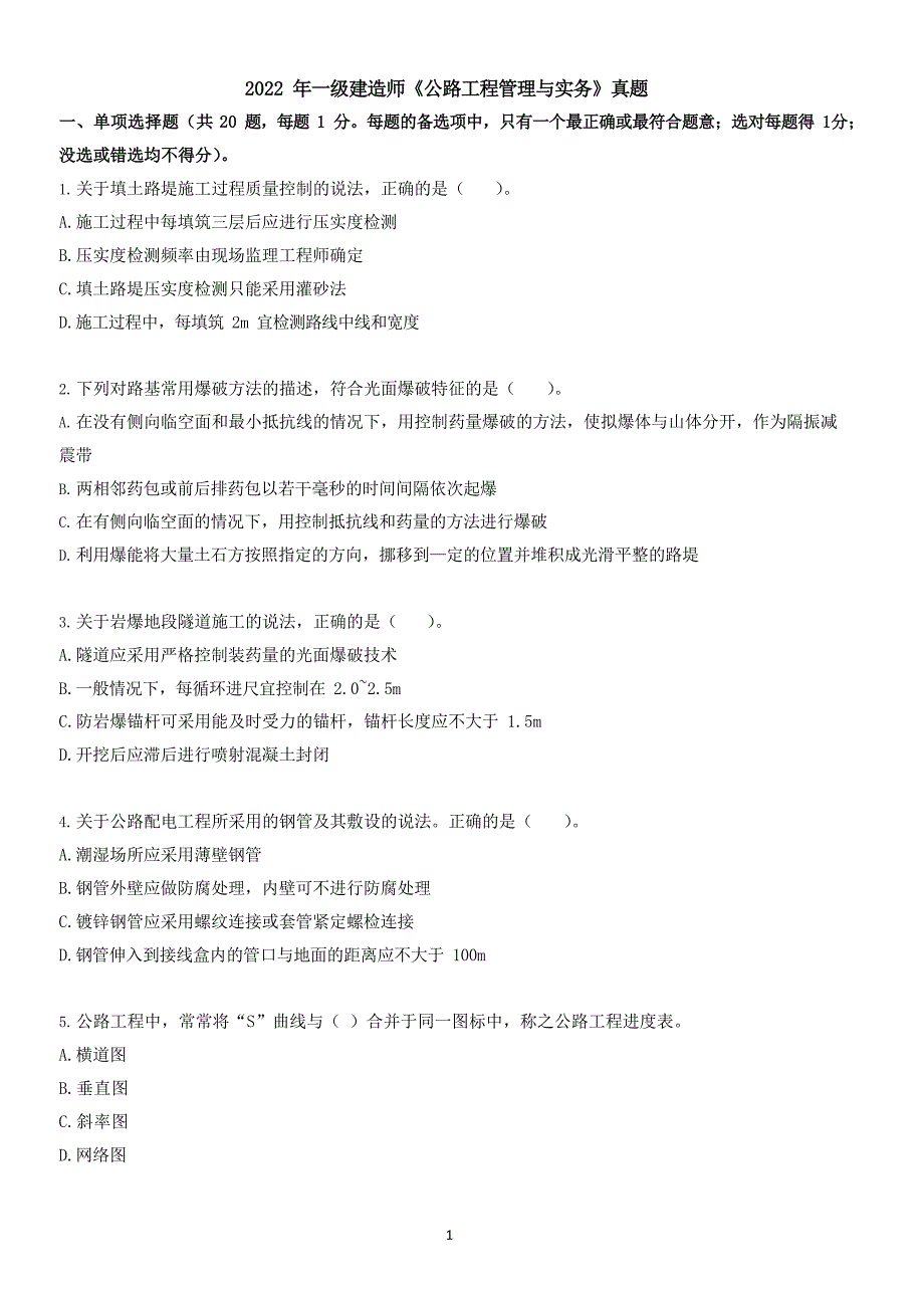 2022 年一级建造师《公路工程管理与实务》真题一、单项选择题(共 20 题,每题 1 分每题的备选项中,只有一个最正确或最符合题意;选对每题得 1分;没选或错选均不得分)1. 关于填土路堤施工过程质量控制的说法,正确的是( ) A.施工过程中每填筑三层后应进行压实度检测B.压实度检测频率由现场监理工程师确定 C.填土路堤压实度检测只能采用灌砂法D.施工过程中,每填筑 2m 宜检测路线中线和宽度2. 下列对路基常用爆破方法的描述,符合光面爆破特征的是( )A. 在没有侧向临空面和最小抵抗线的情况下,用控制药量爆破的方法,使拟爆体与山体分开,作为隔振减震带B. 两相邻药包或前后排药包以若干毫秒的时间间隔依次起爆C. 在有侧向临空面的情况下,用控制抵抗线和药量的方法进行爆破D. 利用爆能将大量土石方按照指定的方向,挪移到—定的位置并堆积成光滑平整的路堤3. 关于岩爆地段隧道施工的说法,正确的是( ) A.隧道应采用严格控制装药量的光面爆破技术B.一般情况下,每循环进尺宜控制在 2.0~2.5mC.防岩爆锚杆可采用能及时受力的锚杆,锚杆长度应不大于 1.5m D.开挖后应滞后进行喷射混凝土封闭4. 关于公路配电工程所采用的钢管及其敷设的说法。