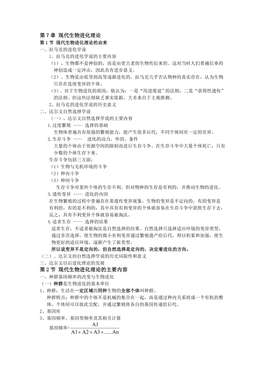 第7章 现代生物进化理论第1节 现代生物进化理论的由来一、拉马克的进化学说1、拉马克的进化学说的主要内容(1)、生物都不是神创的,而是由更古老的生物传衍来的这对当时人们普遍信奉的神创造成一定冲击,因此具有进步意义2)、生物是由低等到高等逐渐进化的拉马克几乎否认物种的真实存在,认为生物只存在连续变异的个体3)、对于生物进化的原因,他认为:一是“用进废退”的法则;二是“获得性遗传”的法则但这些法则缺乏事实依据,大多来自于主观推测2、拉马克的进化学说的历史意义 二、达尔文自然选择学说(一)、达尔文自然选择学说的主要内容1.过度繁殖 ---- 选择的基础 生物体普遍具有很强的繁殖能力,能产生很多后代,不同个体间有一定的差异2.生存斗争 ---- 进化的动力、外因、条件 大量的个体由于资源空间的限制而进行生存斗争在生存斗争中大量个体死亡,只有少数的个体生存下来生存斗争包括三方面:(1)生物与无机环境的斗争(2)种内斗争(3)种间斗争 生存斗争对某些个体的生存不利,但对物种的生存是有利的,并推动生物的进化3.遗传变异 ---- 进化的内因在生物繁殖的过程中普遍存在着遗传变异现象,生物的变异是不定向的,有的变异是有利的,有的是不利的,其中具有有利变异的个体就容易在生存斗争中获胜生存下去,反之,具有不利变异个体就容易被淘汰。