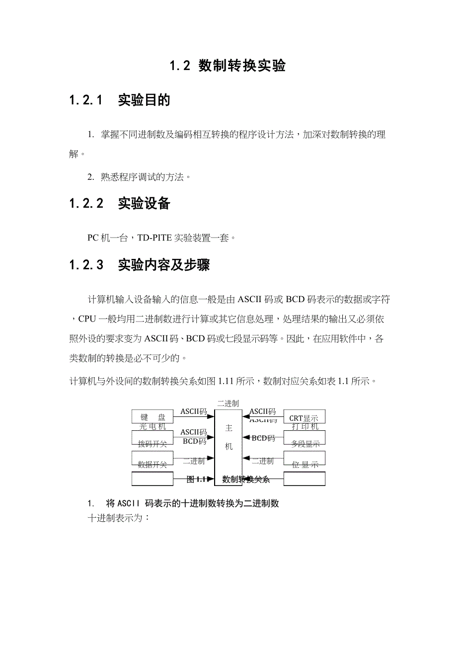 1.2 数制转换实验1.2.1 实验目的1. 掌握不同进制数及编码相互转换的程序设计方法,加深对数制转换的理解2. 熟悉程序调试的方法1.2.2 实验设备PC 机一台,TD-PITE 实验装置一套1.2.3 实验内容及步骤计算机输入设备输入的信息一般是由 ASCII 码或 BCD 码表示的数据或字符,CPU 一般均用二进制数进行计算或其它信息处理,处理结果的输出又必须依照外设的要求变为 ASCII 码、BCD 码或七段显示码等因此,在应用软件中, 各类数制的转换是必不可少的键盘ASCII码二进制ASCII码CRT显示ASCII码计算机与外设间的数制转换关系如图 1.11 所示,数制对应关系如表 1.1 所示光 电 机ASCII码主打 印 机拨码开关BCD码BCD码机多段显示数据开关二进制图 1.11二进制数制转换关系位 显 示1. 将 ASCII 码表示的十进制数转换为二进制数十进制表示为:D ´10 nn+ Dn-1´10 n-1 + ××× + D0´100= åni=0D ´10i (1)iD 代表十进制数 0,1,2,…,9;i上式转换为:åni=0D ´10i = (×××((D ´10 + D ) ´10 + D ) ´10 + ××× + D ) ´10 + D (2)i n n-1 n-2 1 0由式( 2)可归纳十进制数转换为二进制数的方法:从十进制数的最高位Dn 开始作乘 10 加次位的操作,依次类推,则可求出二进制数的结果。