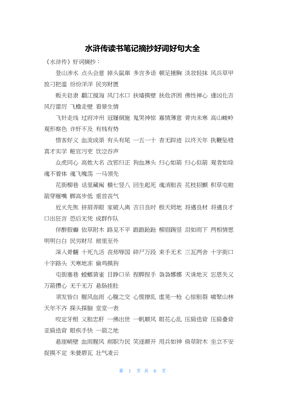 水浒传读书笔记摘抄好词好句大全《水浒传》好词摘抄: 登山涉水 点头会意 掉头鼠窜 多言多语 顿足捶胸 淡妆轻抹 风兵草甲 放刁把滥 纷纷洋洋 民穷财匮 贩夫皂隶 翻江搅海 风门水口 扶墙摸壁 扶危济困 佛性禅心 逢凶化吉 风行雷厉 飞檐走壁 看景生情 飞针走线 过府冲州 冠屦倒施 鬼哭神惊 寡情薄意 骨肉未寒 高山峻岭 观形察色 诈奸不及 有钱有势 惜客好义 血流成渠 有头有尾 一五一十 杳无踪迹 以终天年 执鞭坠镫 真才实学 赃官污吏 饮泣吞声 众虎同心 高姓大名 改邪归正 狗血淋头 归心如箭 归心似箭 观者如垛 魂不着体 魂飞魄荡 一马领先 花街柳巷 话里藏阄 横七竖八 回生起死 魂消胆丧 花枝招颤 积草屯粮 箭穿雁嘴 脚高步低 垂首丧气 近火先焦 挤眉弄眼 家破人离 吉日良时 极天罔地 将遇良材 将遇良才 口出狂言 恐后无凭 成群作队 佯醉假癫 依草附木 路见不平 踉踉跄跄 柳眉踢竖 泪如雨下 两相情愿 明明白白 民穷财尽 彻里至外 深入骨髓 十死九活 丧师辱国 碎尸万段 束手无术 三瓦两舍 十字街口 十字路头 天寒地冻 偷鸡摸狗 屯街塞巷 螳螂黄雀 目睁口呆 捏脚捏手 袅袅娜娜 天诛地灭 忘恩失义 万箭攒心 无千无万 悬肠挂肚 须发皆白 腥风血雨 心腹之交 心慌撩乱 虚晃一枪 心惊胆裂 啸聚山林 天年不齐 探头探脑 堂堂一表 咬定牙根 义胆忠肝 一佛出世 一帆顺风 眼花心乱 压肩迭背 压肩叠背 亚肩迭背 眼疾手快 一箭之地 悬崖峭壁 血雨腥风 削职为民 笑逐颜开 用兵如神 倚草附木 坐立不安 捉摸不定 朱甍碧瓦 壮气凌云 自取罪戾 浓妆艳抹 屁滚尿流 炮龙烹凤 披头盖脑 披头散发 千恩万谢 七横八竖 气急败坏 青面獠牙 相机行事 七上八落 七损八伤 七上八下 弃邪归正 缺一不可 人非草木 如饥如渴 人困马乏 人山人海 色胆如天 说地谈天 深根固蒂 烧眉之急 四平八稳 似漆如胶 三推六问 去住无门 言清行浊 一箭之遥 说白道绿 三智五猜 十病九痛 鹅行鸭步 执鞭随镫 搜根剔齿 单丝不线 近火先焦 推聋妆哑 买上嘱下 成团打块 喘息未定 藏踪蹑迹 冲州撞府 德薄才疏 大败亏输 独出心裁 大刀阔斧 鼎分三足 面色如土 大呼小喝 跌脚槌胸 多见广识 倒街卧巷 大街小巷 顿口无言 当面错过 东挪西撮 大请大受 漫天遍地 《水浒传》好句摘抄: 1、这人吹弹歌舞,刺枪使棒,相扑顽耍,颇能诗书词赋。