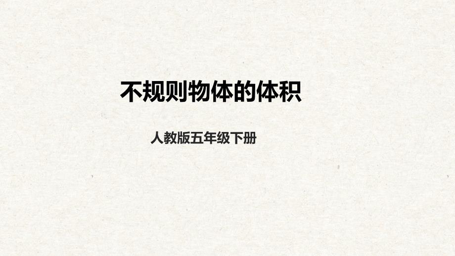不规则物体的体积人教版五年级下册内容总览学习目标学习目标01新知导入新知导入02探究新知探究新知03课堂练习课堂练习04课堂总结课堂总结05分层作业分层作业06目录目录教学目标通过探索生活中一些不规则物体体积的测量方法,使学生加深对所学知识的理解和深化通过探究过程,感受数学知识间的相互联系,体会“转化”的数学思想,树立学习数学的信心经历探究测量不规则物体体积方法的过程,培养学生观察思考的能力及小组合作能力练习导入计算下面物体的体积(单位:cm)12558长方体 正方体 V=abh=1255=300(cm)V=a=888=512(cm)练习导入分 类(连 一连)规则物体 不规则物体练习导入说一说:什么是规则物体?什么是不规则物体?不规则物体指的是物体的外形不规则,即其外形不是标准的立体形状规则物体指的是能够运用基本公式计算体积的物体怎么求不规则物体的体积?新知导入不规则物体的体积新知讲解设法求出下面两种物体的体积橡皮泥土豆新知讲解要求:1、组内说出自己测量两种物体体积的方法2、组内合作实验,测量体积小组合作学习新知讲解展示汇报橡皮泥可以改变形状我把橡皮泥捏成规则的长方体或正方体再求体积橡皮泥新知讲解土豆土豆不能改变形状怎么办呢?新知讲解皇冠的体积新知讲解说 一 说测量不规则物体的体积用什么方法?排水法。