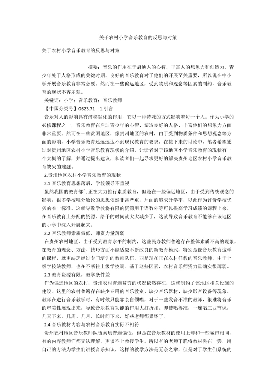 关于农村小学音乐教育的反思与对策 关于农村小学音乐教育的反思与对策 摘要:音乐的作用在于启迪人的心智,丰富人的想象力和创造力,青少年处于人格形成的关键时期,良好的音乐教育对于他们的开展至关重要,所以说在中小学开展音乐教育非常必要然而在一些偏远地区,受到物质和观念等因素的制约,音乐教育的现状不容乐观 关键词:小学;音乐教育;音乐教师 【中国分类号】G623.71 1.引言 音乐对人的影响具有潜移默化的作用,它以一种特殊的方式影响着每一个人作为小学的必修课程之一,音乐教育在启迪青少年的心智、塑造良好的人格、丰富他们的想象力方面非常重要然而在一些贫困地区,像贵州地区的农村,由于受到物质条件和思想观念等方面的影响,小学音乐教育还远远达不到现代教育的要求,在接下来的讨论中,笔者希望通过对贵州地区农村小学音乐教育现状的介绍,让读者对于该地区小学音乐教育的现状有一个大概的了解,并通过提出建议,和读者们一起寻求更好的解决贵州地区农村小学音乐教育缺失的难题 2.贵州地区农村小学音乐教育的现状 2.1音乐教育思想落后,学校领导不重视 虽然我国的教育部门正在大力推行素质教育,但是在一些偏远地区,由于受到传统观念的影响,很多学校唯分数论的思想依然非常严重,片面的追求升学率,以此作为评价学校优劣的唯一标准。