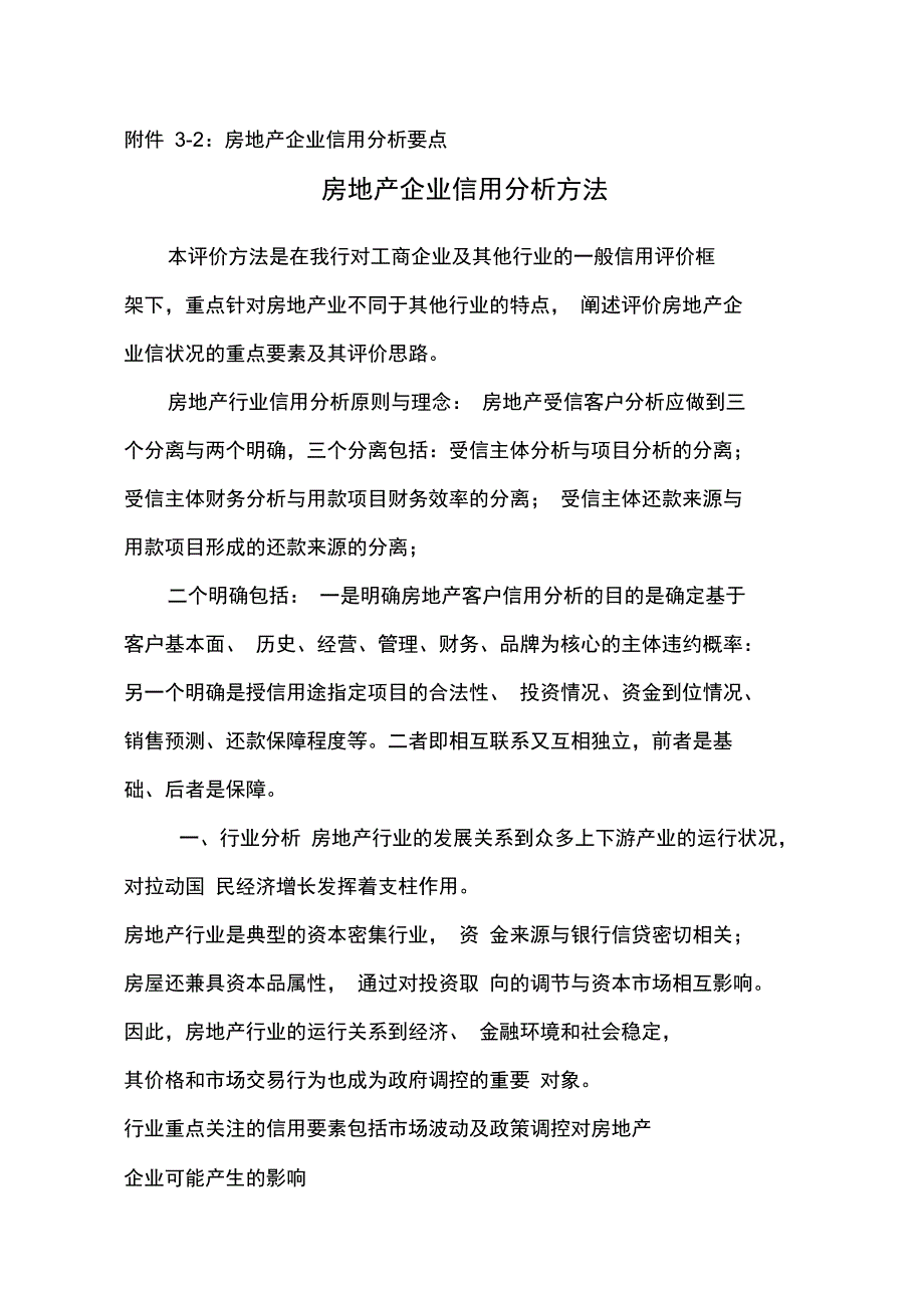 附件 3-2:房地产企业信用分析要点房地产企业信用分析方法本评价方法是在我行对工商企业及其他行业的一般信用评价框 架下,重点针对房地产业不同于其他行业的特点, 阐述评价房地产企 业信状况的重点要素及其评价思路房地产行业信用分析原则与理念: 房地产受信客户分析应做到三 个分离与两个明确,三个分离包括:受信主体分析与项目分析的分离; 受信主体财务分析与用款项目财务效率的分离; 受信主体还款来源与 用款项目形成的还款来源的分离;二个明确包括: 一是明确房地产客户信用分析的目的是确定基于 客户基本面、 历史、经营、管理、财务、品牌为核心的主体违约概率: 另一个明确是授信用途指定项目的合法性、 投资情况、资金到位情况、 销售预测、还款保障程度等二者即相互联系又互相独立,前者是基 础、后者是保障一、行业分析 房地产行业的发展关系到众多上下游产业的运行状况, 对拉动国 民经济增长发挥着支柱作用 房地产行业是典型的资本密集行业, 资 金来源与银行信贷密切相关; 房屋还兼具资本品属性, 通过对投资取 向的调节与资本市场相互影响 因此,房地产行业的运行关系到经济、 金融环境和社会稳定, 其价格和市场交易行为也成为政府调控的重要 对象。