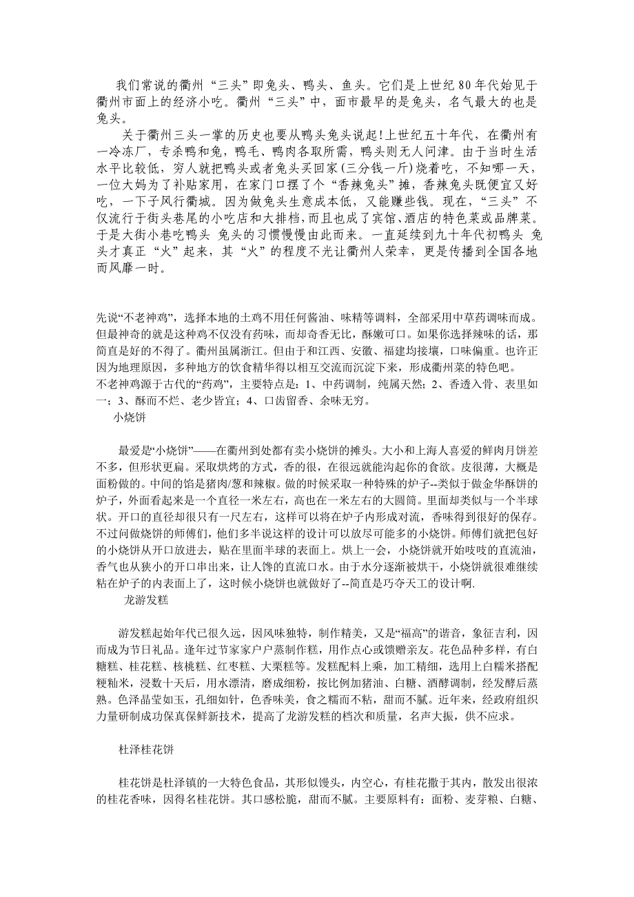 我们常说的衢州“三头”即兔头、鸭头、鱼头它们是上世纪80年代始见于衢州市面上的经济小吃衢州“三头”中,面市最早的是兔头,名气最大的也是兔头 关于衢州三头一掌的历史也要从鸭头兔头说起!上世纪五十年代,在衢州有一冷冻厂,专杀鸭和兔,鸭毛、鸭肉各取所需,鸭头则无人问津由于当时生活水平比较低,穷人就把鸭头或者兔头买回家(三分钱一斤)烧着吃,不知哪一天,一位大妈为了补贴家用,在家门口摆了个“香辣兔头”摊,香辣兔头既便宜又好吃,一下子风行衢城因为做兔头生意成本低,又能赚些钱现在,“三头”不仅流行于街头巷尾的小吃店和大排档,而且也成了宾馆、酒店的特色菜或品牌菜于是大街小巷吃鸭头 兔头的习惯慢慢由此而来一直延续到九十年代初鸭头 兔头才真正“火”起来,其“火”的程度不光让衢州人荣幸,更是传播到全国各地而风靡一时 先说“不老神鸡”,选择本地的土鸡不用任何酱油、味精等调料,全部采用中草药调味而成但最神奇的就是这种鸡不仅没有药味,而却奇香无比,酥嫩可口如果你选择辣味的话,那简直是好的不得了衢州虽属浙江但由于和江西、安徽、福建均接壤,口味偏重也许正因为地理原因,多种地方的饮食精华得以相互交流而沉淀下来,形成衢州菜的特色吧。