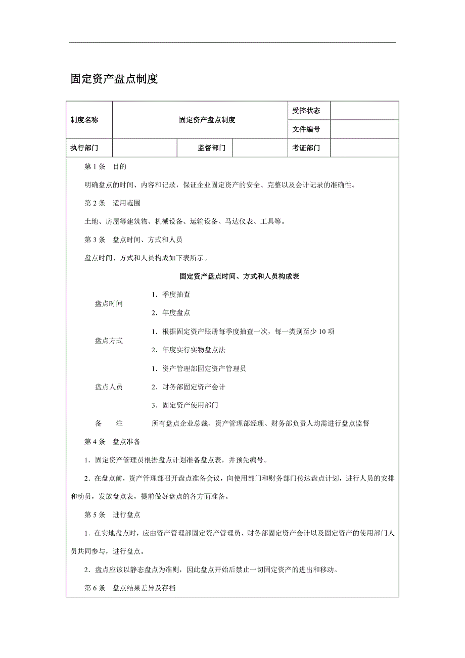 固定资产盘点制度制度名称固定资产盘点制度受控状态文件编号执行部门监督部门考证部门第1条 目的明确盘点的时间、内容和记录,保证企业固定资产的安全、完整以及会计记录的准确性第2条 适用范围土地、房屋等建筑物、机械设备、运输设备、马达仪表、工具等第3条 盘点时间、方式和人员盘点时间、方式和人员构成如下表所示固定资产盘点时间、方式和人员构成表盘点时间1.季度抽查2.年度盘点盘点方式1.根据固定资产账册每季度抽查一次,每一类别至少10项2.年度实行实物盘点法盘点人员1.资产管理部固定资产管理员2.财务部固定资产会计3.固定资产使用部门备 注所有盘点企业总裁、资产管理部经理、财务部负责人均需进行盘点监督第4条 盘点准备1.固定资产管理员根据盘点计划准备盘点表,并预先编号2.在盘点前,资产管理部召开盘点准备会议,向使用部门和财务部门传达盘点计划,进行人员的安排和动员,发放盘点表,提前做好盘点的各方面准备第5条 进行盘点1.在实地盘点时,应由资产管理部固定资产管理员、财务部固定资产会计以及固定资产的使用部门人员共同参与,进行盘点2.盘点应该以静态盘点为准则,因此盘点开始后禁止一切固定资产的进出和移动。