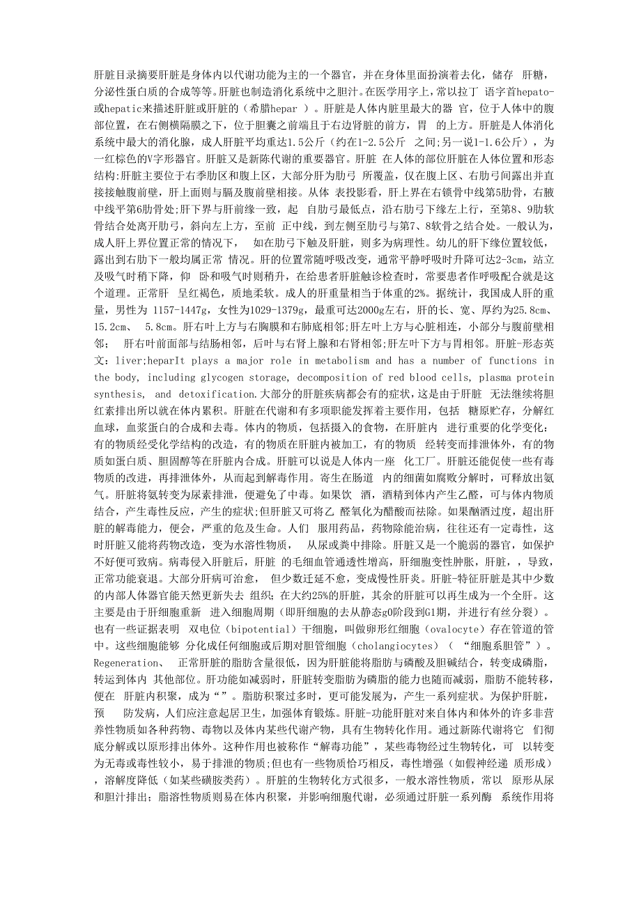 也有一些证据表明 双电位(bipotential)干细胞,叫做卵形红细胞(ovalocyte)存在管道的管中这些细胞能够 分化成任何细胞或后期对胆管细胞(cholangiocytes)( “细胞系胆管”)Regeneration、 正常肝脏的脂肪含量很低,因为肝脏能将脂肪与磷酸及胆碱结合,转变成磷脂,转运到体内 其他部位肝功能如减弱时,肝脏转变脂肪为磷脂的能力也随而减弱,脂肪不能转移,便在 肝脏内积聚,成为“”脂肪积聚过多时,更可能发展为,产生一系列症状为保护肝脏,预 防发病,人们应注意起居卫生,加强体育锻炼肝脏-功能肝脏对来自体内和体外的许多非营 养性物质如各种药物、毒物以及体内某些代谢产物,具有生物转化作用通过新陈代谢将它 们彻底分解或以原形排出体外这种作用也被称作“解毒功能”,某些毒物经过生物转化,可 以转变为无毒或毒性较小,易于排泄的物质;但也有一些物质恰巧相反,毒性增强(如假神经递 质形成),溶解度降低(如某些磺胺类药)肝脏的生物转化方式很多,一般水溶性物质,常以 原形从尿和胆汁排出;脂溶性物质则易在体内积聚,并影响细胞代谢,必须通过肝脏一系列酶 系统作用将其灭活,或转化为水溶性物质,再予排出。