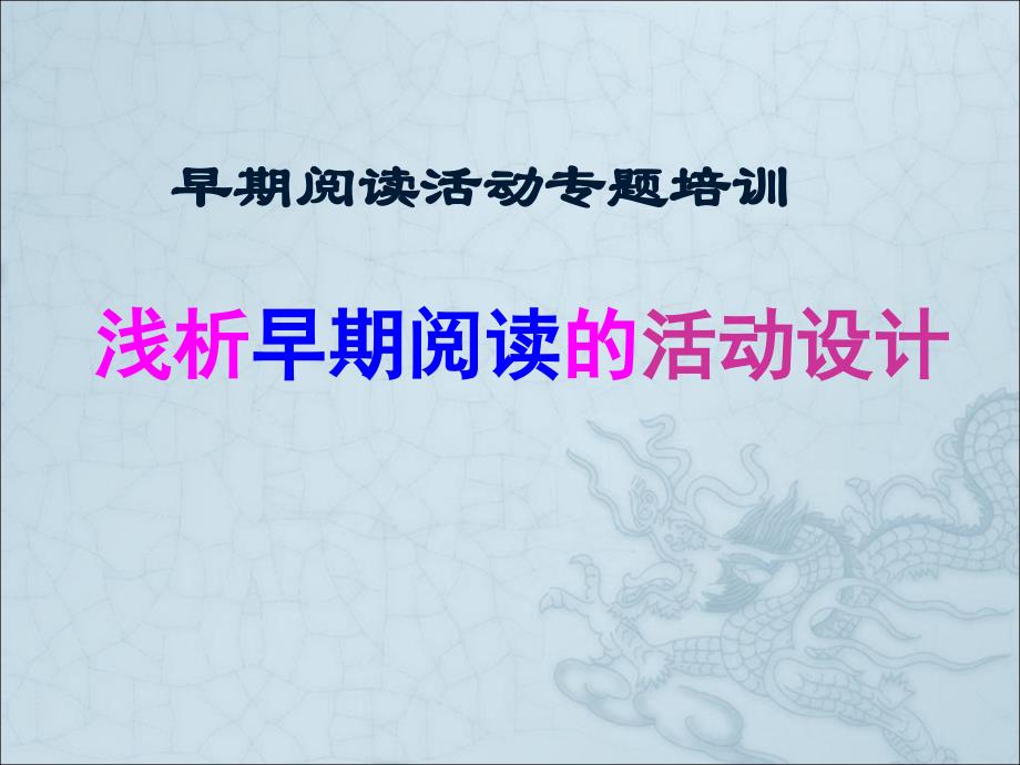 早期阅读活动专题培训,浅析早期阅读的活动设计,重 温,早期阅读活动 早期阅读是指0~6岁学前儿童运用视觉、听觉、口语,甚至身体动作,或凭借成人形象的读讲等综合手段来理解色彩、图像、声音、文字等多种符号意义的所有活动 是一个集观察、思考、记忆、表达等多种认知为一体的综合活动过程一、早期阅读的目标取向,1、激发阅读兴趣——爱上阅读 这种好奇和兴趣是阅读的原动力, 倾听故事的兴趣 爱听 阅读活动的兴趣 爱读 对书籍的喜爱 爱书 对故事表达的兴趣 爱讲,适合的阅读方式(互动阅读:视听、师幼) 适度的理解阅读(新发现) 适宜的阅读氛围(自主自由) 适量的阅读容量 一定的阅读能力(会读),2、养成阅读行为习惯——主动的阅读行为,倾听习惯(安静 礼貌 注意) 用眼习惯 爱惜书的习惯(取放 收拾) 认真看书的习惯(安静、专注、有顺序仔细),3、发展阅读能力——会阅读,识别能力:是指儿童对图画故事书中出现的事物、背景、细节等的觉察、指认、分辨有什么? 匹配能力:是指幼儿对图画和文字进行的对应,以及文字与成人所讲语言的对应 书 页面 语句 理解能力:联结是指幼儿对图画故事书情节内部的联结,以及图画故事书情节之间、事件关系、角色之间的联结 鸟窝 猜测能力:假设是指幼儿阅读时进行的猜测,包括对“人物”心理与事件、发生、原因的猜测。