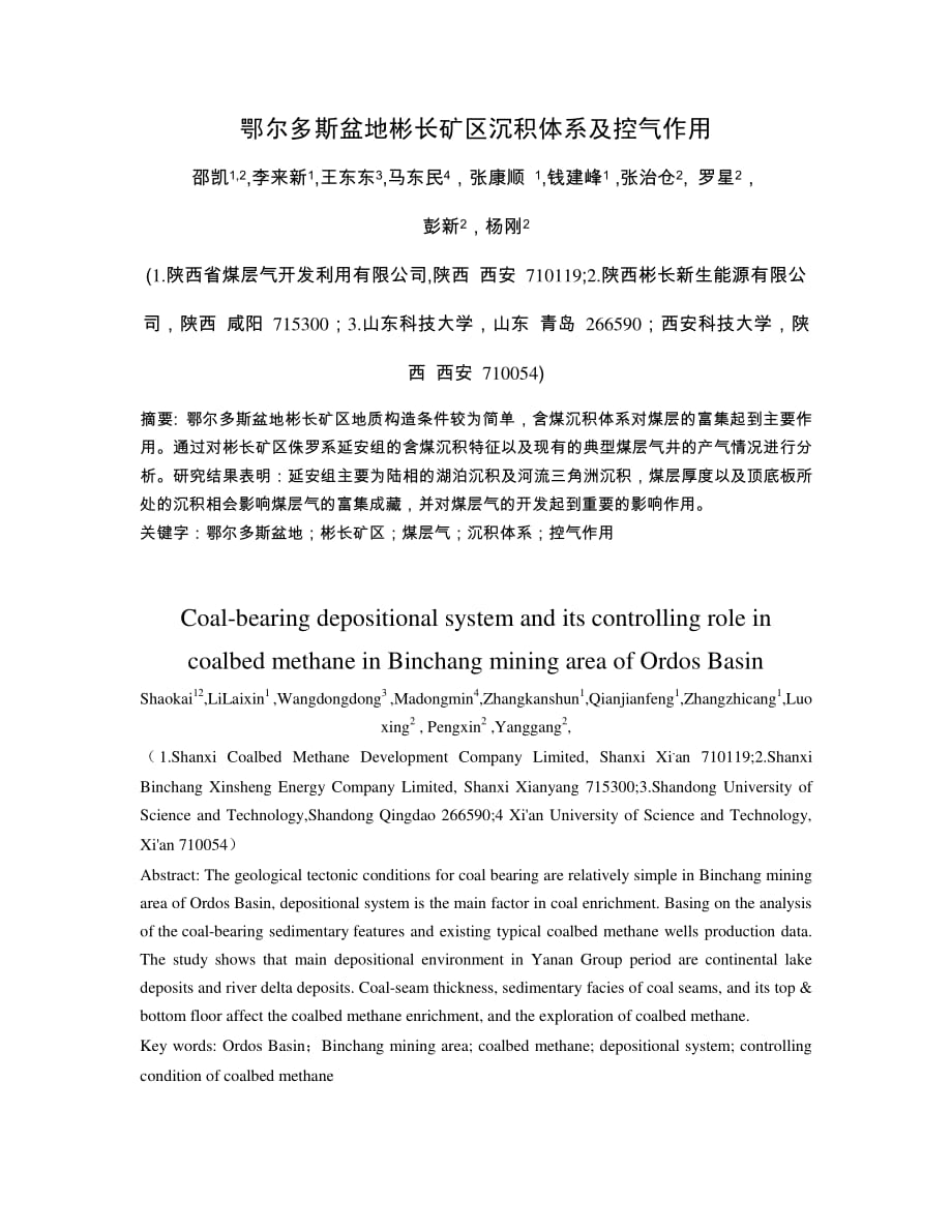 鄂尔多斯盆地彬长矿区沉积体系及控气作用 邵凯1,2,李来新1,王东东3,马东民4,张康顺 1,钱建峰1 ,张治仓2, 罗星2, 彭新2,杨刚2 (1.陕西省煤层气开发利用有限公司,陕西 西安 710119;2.陕西彬长新生能源有限公 司,陕西 咸阳 715300;3.山东科技大学,山东 青岛 266590;西安科技大学,陕 西 西安 710054) 摘要: 鄂尔多斯盆地彬长矿区地质构造条件较为简单,含煤沉积体系对煤层的富集起到主要作 用通过对彬长矿区侏罗系延安组的含煤沉积特征以及现有的典型煤层气井的产气情况进行分 析研究结果表明:延安组主要为陆相的湖泊沉积及河流三角洲沉积,煤层厚度以及顶底板所 处的沉积相会影响煤层气的富集成藏,并对煤层气的开发起到重要的影响作用 关键字:鄂尔多斯盆地;彬长矿区;煤层气;沉积体系;控气作用 Coal-bearing depositional system and its controlling role in coalbed methane in Binchang mining area of Ordos Basin Shaokai12,LiLaixin1 ,Wangdongdong3 ,Madongmin4,Zhangkanshun1,Qianjianfeng1,Zhangzhicang1,Luo xing2 , Pengxin2 ,Yanggang2, (1.Shanxi Coalbed Methane Development Company Limited, Shanxi Xi,an 710119;2.Shanxi Binchang Xinsheng Energy Company Limited, Shanxi Xianyang 715300;3.Shandong University of Science and Technology,Shandong Qingdao 266590;4 Xi'an University of Science and Technology, Xi'an 710054) Abstract: The geological tectonic conditions for coal bearing are relatively simple in Binchang mining area of Ordos Basin, depositional system is the main factor in coal enrichment. Basing on the analysis of the coal-bearing sedimentary features and existing typical coalbed methane wells production data. The study shows that main depositional environment in Yanan Group period are continental lake deposits and river delta deposits. Coal-seam thickness, sedimentary facies of coal seams, and its top coalbed methane; depositional system; controlling condition of coalbed methane 作者简介:邵凯,男,生于 1984 年,博士研究生,现工作于陕西省煤层气开发利用有限公司, 从事煤及煤层气开发利用方面工作。