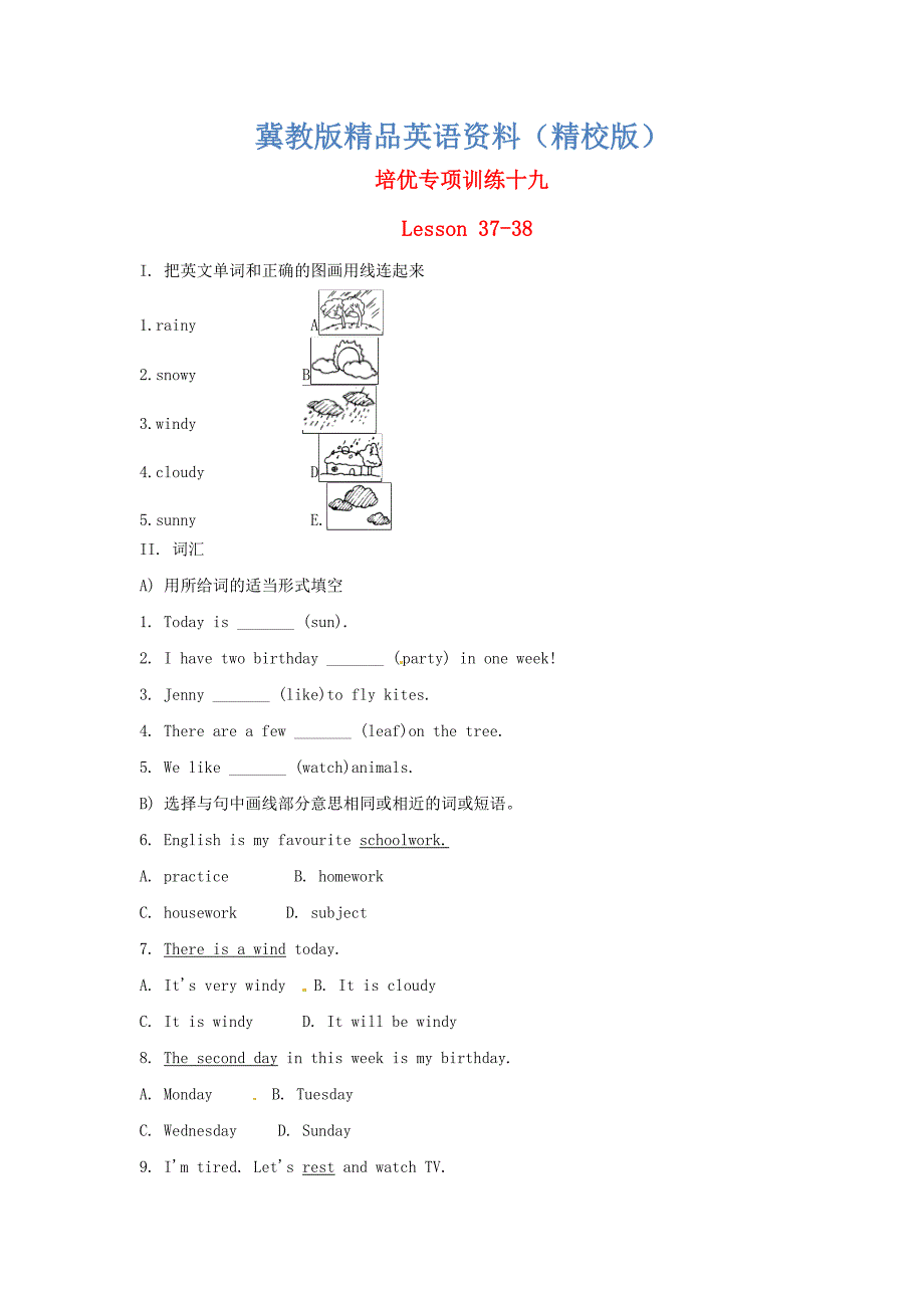 冀教版精品英语资料(精校版)培优专项训练十九 Lesson 37-38I. 把英文单词和正确的图画用线连起来1.rainy A 2.snowy B 3.windy 4.cloudy D 5.sunny E. II. 词汇A) 用所给词的适当形式填空1. Today is _______ (sun). 2. I have two birthday _______ (party) in one week! 3. Jenny _______ (like)to fly kites. 4. There are a few _______ (leaf)on the tree. 5. We like _______ (watch)animals. B) 选择与句中画线部分意思相同或相近的词或短语 6. English is my favourite schoolwork. A. practice B. homework C. housework D. subject 7. There is a wind today. A. It's very windy B. It is cloudy C. It is windy D. It will be windy 8. The second day in this week is my birthday. A. Monday B. Tuesday C. Wednesday D. Sunday 9. I'm tired. Let's rest and watch TV. A. sleep B. have a rest C. stand D. turn 10. What time is breakfast? A. How B. Where C. When D. Why III. 改错。