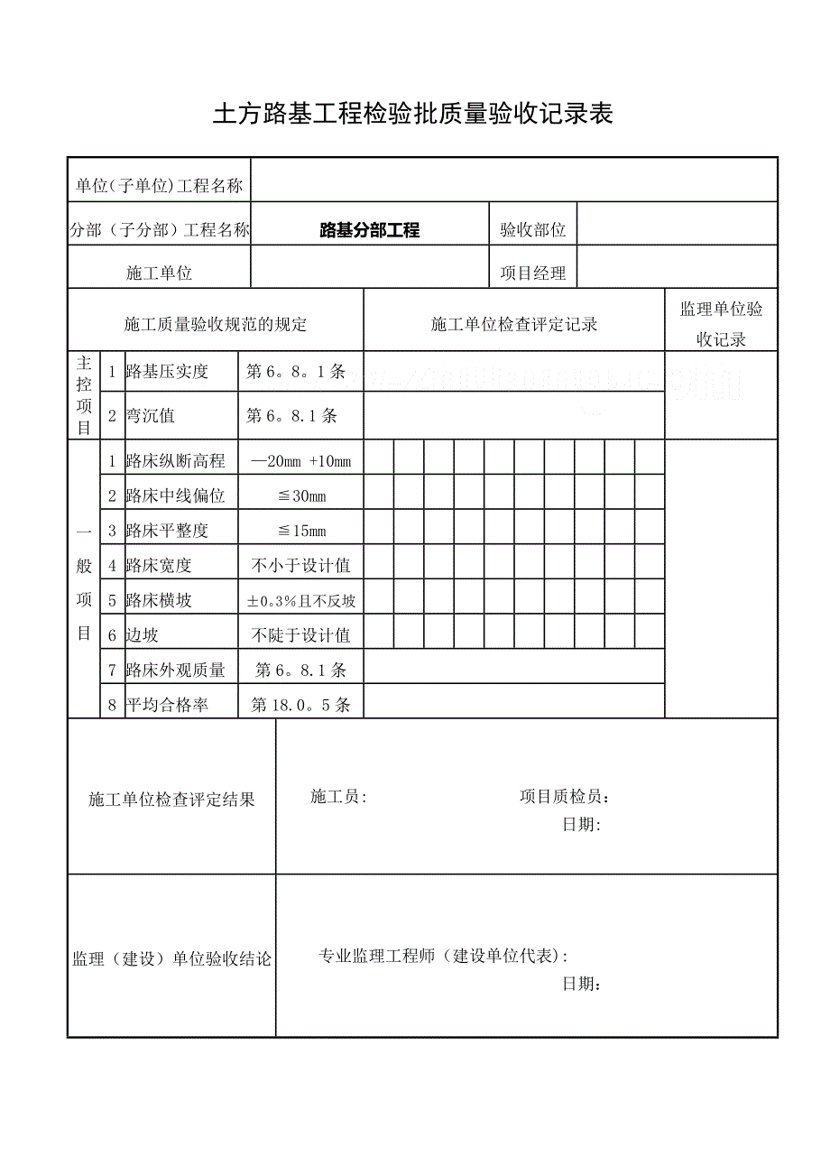 土方路基工程检验批质量验收记录表 单位(子单位)工程名称分部(子分部)工程名称路基分部工程验收部位施工单位项目经理施工质量验收规范的规定施工单位检查评定记录监理单位验收记录主控项目1路基压实度第61条 2弯沉值第68.1条 一般项目1路床纵断高程—20mm +10mm 2路床中线偏位≦30mm3路床平整度≦15mm4路床宽度不小于设计值5路床横坡±03%且不反坡6边坡不陡于设计值7路床外观质量第68.1条8平均合格率第18.05条施工单位检查评定结果 施工员: 项目质检员: 日期: 监理(建设)单位验收结论 专业监理工程师(建设单位代表):日期: 土方路基分项工程质量验收记录表 单位(子单位)工程名称分部(子分部)工程名称路基分部工程检验批数施工单位项目经理序号检验批名称及部位、区段施工单位检查评定结果监理(建设)单位验收结论12345678910检查结论项目专业技术负责人: 日期: 验收结论监理工程师(建设单位代表):日期: 路基分部(子分部)工程质量验收记录表 单位(子单位)工程名称施工单位项目技术负责人质量部门负责人序 号分项工程名称检验批数施工单位检查评定监理单位验收意见112342质量控制资料3安全和功能检验(检测)报告4观感质量验收验收单位施工单位项目经理: 日期: 勘察单位 项目负责人: 日期:设计单位项目负责人: 日期:监理(建设)单位 总监理工程师: 日期: (建设单位项目负责人): 石灰土基层工程检验批质量验收记录表 单位(子单位)工程名称分部(子分部)工程名称基层分部工程验收部位施工单位项目经理施工质量验收规范的规定施工单位检查评定记录监理单位验收记录主控项目1原材料质量第7.8。