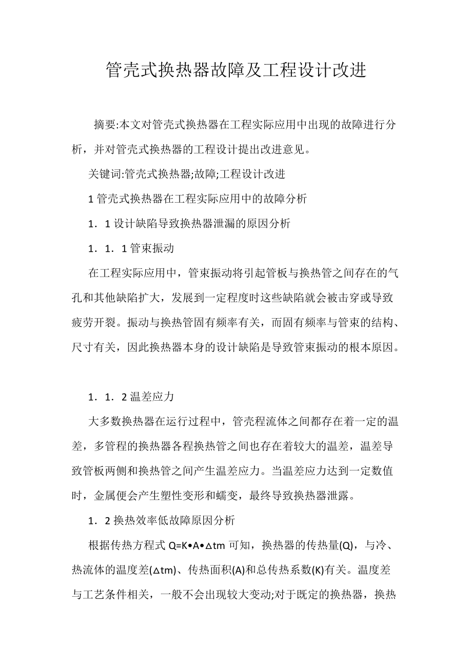 管壳式换热器故障及工程设计改进摘要:本文对管壳式换热器在工程实际应用中出现的故障进行分析,并对管壳式换热器的工程设计提出改进意见 关键词:管壳式换热器;故障;工程设计改进 1管売式换热器在工程实际应用中的故障分析 1.1设计缺陷导致换热器泄漏的原因分析 1.1.1管束振动 在工程实际应用中,管束振动将引起管板与换热管之间存在的气孔和其他缺陷扩大,发展到一定程度时这些缺陷就会被击穿或导致疲劳开裂振动与换热管固有频率有关,而固有频率与管束的结构、尺寸有关,因此换热器本身的设计缺陷是导致管束振动的根本原因 1.1.2温差应力 大多数换热器在运行过程中,管壳程流体之间都存在着一定的温差,多管程的换热器各程换热管之间也存在着较大的温差,温差导致管板两侧和换热管之间产生温差应力当温差应力达到一定数值时,金属便会产生塑性变形和蠕变,最终导致换热器泄露 1.2换热效率低故障原因分析 根据传热方程式Q=K•A•△tm可知,换热器的传热量(Q),与冷、热流体的温度差(△tm)、传热面积(A)和总传热系数(K)有关温度差与工艺条件相关,一般不会出现较大变动;对于既定的换热器,换热面积为定值因此,工业实际应用中,换热效率降低都是因为总传热系数降低引起的。