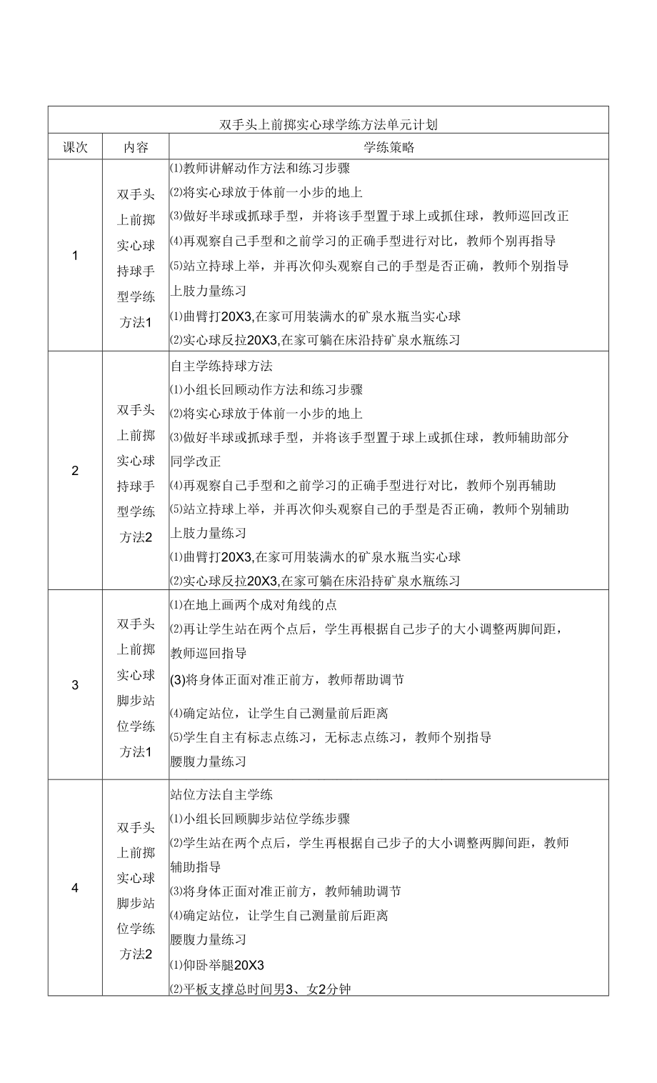 双手头上前掷实心球学练方法单元计划课次内容学练策略1双手头 上前掷 实心球 持球手 型学练 方法1⑴教师讲解动作方法和练习步骤⑵将实心球放于体前一小步的地上⑶做好半球或抓球手型,并将该手型置于球上或抓住球,教师巡回改正⑷再观察自己手型和之前学习的正确手型进行对比,教师个别再指导⑸站立持球上举,并再次仰头观察自己的手型是否正确,教师个别指导 上肢力量练习⑴曲臂打20X3,在家可用装满水的矿泉水瓶当实心球⑵实心球反拉20X3,在家可躺在床沿持矿泉水瓶练习2双手头 上前掷 实心球 持球手 型学练 方法2自主学练持球方法⑴小组长回顾动作方法和练习步骤⑵将实心球放于体前一小步的地上⑶做好半球或抓球手型,并将该手型置于球上或抓住球,教师辅助部分 同学改正⑷再观察自己手型和之前学习的正确手型进行对比,教师个别再辅助 ⑸站立持球上举,并再次仰头观察自己的手型是否正确,教师个别辅助 上肢力量练习⑴曲臂打20X3,在家可用装满水的矿泉水瓶当实心球⑵实心球反拉20X3,在家可躺在床沿持矿泉水瓶练习3双手头 上前掷 实心球 脚步站 位学练 方法1⑴在地上画两个成对角线的点⑵再让学生站在两个点后,学生再根据自己步子的大小调整两脚间距, 教师巡回指导(3)将身体正面对准正前方,教师帮助调节⑷确定站位,让学生自己测量前后距离⑸学生自主有标志点练习,无标志点练习,教师个别指导腰腹力量练习⑴仰卧举腿20X3⑵平板支撑总时间男3、女2分钟4双手头 上前掷 实心球 脚步站 位学练 方法2站位方法自主学练⑴小组长回顾脚步站位学练步骤⑵学生站在两个点后,学生再根据自己步子的大小调整两脚间距,教师 辅助指导⑶将身体正面对准正前方,教师辅助调节⑷确定站位,让学生自己测量前后距离腰腹力量练习⑴仰卧举腿20X3⑵平板支撑总时间男3、女2分钟5双手头 上前掷 实心球 超越器 械的背 弓动作 学练方 法1超越器械的背弓动作学练步骤⑴举球站好位,身体姿势微蹲,教师巡回指导⑵手臂弯曲,教师个别指导⑶徒手,身体后仰静止后全身协调发力挥肾做投掷动作,教师指挥并巡 回指导⑷持轻球做投球练习,教师巡回指导下肢力量练习⑴弓步交换跳20X3 ⑵蹲起30X36双手头 上前掷 实心球 超越器 械的背 弓动作 学练方 法2超越器械的背弓动作自主学练⑴小组长回顾超越器械的背弓动作学练步骤,教师辅助⑵举球站好位,身体姿势微蹲(3)手臂弯曲⑷徒手,身体后仰静止后全身协调发力挥臂做投掷动作⑸持轻球做投球练习下肢力量练习⑴弓步交换跳20X3 ⑵蹲起30X37双手头 上前掷 实心球 发力顺 序学练 方法1投掷发力顺序学练方法学练步骤⑴学校地处农村,让学生每人带一根竹枝条,课上练习挥臂,体会手臂 各关节的发力顺序⑵持足球体会全身协调发力顺序⑶持实心球完整体会发力顺序腰腹力量练习⑴仰卧举腿20X3 ⑵平板支撑总时间男3、女2分钟8双手头 上前掷 实心球 发力顺 序学练 方法2投掷发力顺序学练方法自主学练⑴小组长恒1顾投掷发力顺序学练方法学练步骤,教师辅助⑵挥竹枝条,体会手臂各关节的发力顺序⑶持足球体会全身协调发力顺序⑷持实心球完整体会发力顺序上肢力量练习⑴俯卧撑男20X3、女15X3⑵曲臂悬垂总时间2分钟⑶曲臂打20X3,在家可用装满水的矿泉水瓶当实心球 ⑷实心球反拉20X3,在家可躺在床沿持矿泉水瓶练习9双手头上前掷实心球发力顺序学练方法自主学练⑴小组长回顾投掷发力顺序学练方法学练步骤,教师辅助⑵挥竹枝条,体会手曾各关节的发力顺序⑶持足球体会全身协调发力顺y发力顺序学练方法3⑷持实心球完整体会发力顺序 下肢力量练习⑴弓步交换跳20X3 ⑵蹲起30X310双手头 上前掷 实心球 动作方 法考核1. 双手头上前掷实心球动作方法考核2. 教师安排小组练习及考核要求,安全的具体事项3. 未轮到考核学生分组自主练习,考核完的继续练习11双手头上前掷实心球 成绩考 核1. 双手头上前掷实心球成绩考核2. 教师安排小组练习及考核要求,安全的具体事项3. 未轮到考核学生分组自主练习,考核完的继续练习。