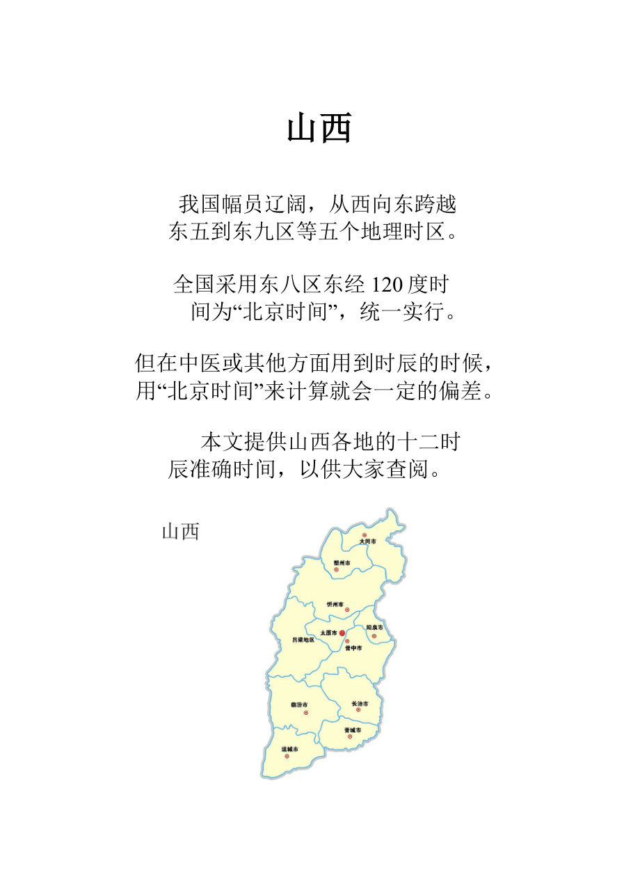 山西我国幅员辽阔,从西向东跨越东五到东九区等五个地理时区全国采用东八区东经120度时间为“北京时间”,统一实行但在中医或其他方面用到时辰的时候,用“北京时间”来计算就会一定的偏差本文提供山西各地的十二时辰准确时间,以供大家查阅太原市时 差:比“北京时间”晚29分47秒正午时间:12:29:47本地十二时辰子时:23:29:47 - 01:29:46;丑时:01:29:47 - 03:29:46;寅时:03:29:47 - 05:29:46;卯时:05:29:47 - 07:29:46;辰时:07:29:47 - 09:29:46;巳时:09:29:47 - 11:29:46;午时:11:29:47 - 13:29:46;未时:13:29:47 - 15:29:46;申时:15:29:47 - 17:29:46;酉时:17:29:47 - 19:29:46;戌时:19:29:47 - 21:29:46;亥时:21:29:47 - 23:29:46;太原市 小店区时 差:比“北京时间”晚29分43秒正午时间:12:29:43本地十二时辰子时:23:29:43 - 01:29:42;丑时:01:29:43 - 03:29:42;寅时:03:29:43 - 05:29:42;卯时:05:29:43 - 07:29:42;辰时:07:29:43 - 09:29:42;巳时:09:29:43 - 11:29:42;午时:11:29:43 - 13:29:42;未时:13:29:43 - 15:29:42;申时:15:29:43 - 17:29:42;酉时:17:29:43 - 19:29:42;戌时:19:29:43 - 21:29:42;亥时:21:29:43 - 23:29:42;太原市 迎泽区时 差:比“北京时间”晚29分43秒正午时间:12:29:43本地十二时辰子时:23:29:43 - 01:29:42;丑时:01:29:43 - 03:29:42;寅时:03:29:43 - 05:29:42;卯时:05:29:43 - 07:29:42;辰时:07:29:43 - 09:29:42;巳时:09:29:43 - 11:29:42;午时:11:29:43 - 13:29:42;未时:13:29:43 - 15:29:42;申时:15:29:43 - 17:29:42;酉时:17:29:43 - 19:29:42;戌时:19:29:43 - 21:29:42;亥时:21:29:43 - 23:29:42;太原市 杏花岭区时 差:比“北京时间”晚29分43秒正午时间:12:29:43本地十二时辰子时:23:29:43 - 01:29:42;丑时:01:29:43 - 03:29:42;寅时:03:29:43 - 05:29:42;卯时:05:29:43 - 07:29:42;辰时:07:29:43 - 09:29:42;巳时:09:29:43 - 11:29:42;午时:11:29:43 - 13:29:42;未时:13:29:43 - 15:29:42;申时:15:29:43 - 17:29:42;酉时:17:29:43 - 19:29:42;戌时:19:29:43 - 21:29:42;亥时:21:29:43 - 23:29:42;太原市 尖草坪区时 差:比“北京时间”晚30分4秒正午时间:12:30:04本地十二时辰子时:23:30:04 - 01:30:03;丑时:01:30:04 - 03:30:03;寅时:03:30:04 - 05:30:03;卯时:05:30:04 - 07:30:03;辰时:07:30:04 - 09:30:03;巳时:09:30:04 - 11:30:03;午时:11:30:04 - 13:30:03;未时:13:30:04 - 15:30:03;申时:15:30:04 - 17:30:03;酉时:17:30:04 - 19:30:03;戌时:19:30:04 - 21:30:03;亥时:21:30:04 - 23:30:03;太原市 万柏林区时 差:比“北京时间”晚29分55秒正午时间:12:29:55本地十二时辰子时:23:29:55 - 01:29:54;丑时:01:29:55 - 03:29:54;寅时:03:29:55 - 05:29:54;卯时:05:29:55 - 07:29:54;辰时:07:29:55 - 09:29:54;巳时:09:29:55 - 11:29:54;午时:11:29:55 - 13:29:54;未时:13:29:55 - 15:29:54;申时:15:29:55 - 17:29:54;酉时:17:29:55 - 19:29:54;戌时:19:29:55 - 21:29:54;亥时:21:29:55 - 23:29:54;太原市 晋源区时 差:比“北京时间”晚30分4秒正午时间:12:30:04本地十二时辰子时:23:30:04 - 01:30:03;丑时:01:30:04 - 03:30:03;寅时:03:30:04 - 05:30:03;卯时:05:30:04 - 07:30:03;辰时:07:30:04 - 09:30:03;巳时:09:30:04 - 11:30:03;午时:11:30:04 - 13:30:03;未时:13:30:04 - 15:30:03;申时:15:30:04 - 17:30:03;酉时:17:30:04 - 19:30:03;戌时:19:30:04 - 21:30:03;亥时:21:30:04 - 23:30:03;太原市 清徐县时 差:比“北京时间”晚30分36秒正午时间:12:30:36本地十二时辰子时:23:30:36 - 01:30:35;丑时:01:30:36 - 03:30:35;寅时:03:30:36 - 05:30:35;卯时:05:30:36 - 07:30:35;辰时:07:30:36 - 09:30:35;巳时:09:30:36 - 11:30:35;午时:11:30:36 - 13:30:35;未时:13:30:36 - 15:30:35;申时:15:30:36 - 17:30:35;酉时:17:30:36 - 19:30:35;戌时:19:30:36 - 21:30:35;亥时:21:30:36 - 23:30:35;太原市 阳曲县时 差:比“北京时间”晚29分19秒正午时间:12:29:19本地十二时辰子时:23:29:19 - 01:29:18;丑时:01:29:19 - 03:29:18;寅时:03:29:19 - 05:29:18;卯时:05:29:19 - 07:29:18;辰时:07:29:19 - 09:29:18;巳时:09:29:19 - 11:29:18;午时:11:29:19 - 13:29:18;未时:13:29:19 - 15:29:18;申时:15:29:19 - 17:29:18;酉时:17:29:19 - 19:29:18;戌时:19:29:19 - 21:29:18;亥时:21:29:19 - 23:29:18;太原市 娄烦县时 差:比“北京时间”晚32分52秒正午时间:12:32:52本地十二时辰子时:23:32:52 - 01:32:51;丑时:01:32:52 - 03:32:51;寅时:03:32:52 - 05:32:51;卯时:05:32:52 - 07:32:51;辰时:07:32:52 - 09:32:51;巳时:09:32:52 - 11:32:51;午时:11:32:52 - 13:32:51;未时:13:32:52 - 15:32:51;申时:15:32:52 - 17:32:51;酉时:17:32:52 - 19:32:51;戌时:19:32:52 - 21:32:51;亥时:21:32:52 - 23:32:51;太原市 古交市时 差:比“北京时间”晚31分19秒正午时间:12:31:19本地十二时辰子时:23:31:19 - 01:31:18;丑时:01:31:19 - 03:31:18;寅时:03:31:19 - 05:31:18;卯时:05:31:19 - 07:31:18;辰时:07:31:19 - 09:31:18;巳时:09:31:19 - 11:31:18;午时:11:31:19 - 13:31:18;未时:13:31:19 - 15:31:18;申时:15:31:19 - 17:31:18;酉时:17:31:19 - 19:31:18;戌时:19:31:19 - 21:31:18;亥时:21:31:19 - 23:31:18;大同市时 差:比“北京时间”晚26分47秒正午时间:12:26:47本地十二时辰子时:23:26:47 - 01:26:46;丑时:01:26:47 - 03:26:46;寅时:0。