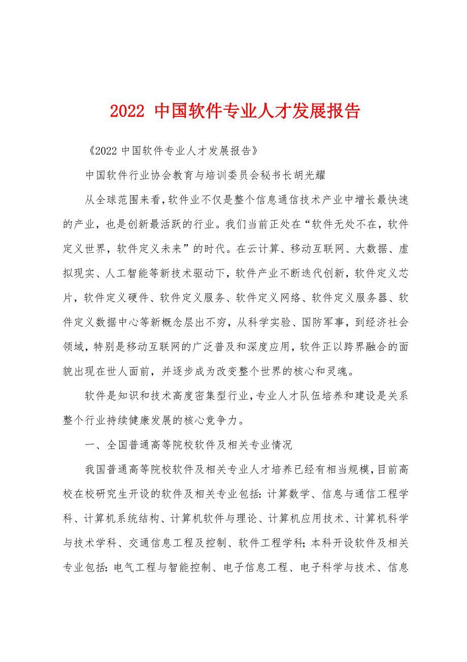 2022 中国软件专业人才发展报告 《2022中国软件专业人才发展报告》 中国软件行业协会教育与培训委员会秘书长胡光耀 从全球范围来看,软件业不仅是整个信息通信技术产业中增长最快速的产业,也是创新最活跃的行业我们当前正处在“软件无处不在,软件定义世界,软件定义未来”的时代在云计算、移动互联网、大数据、虚拟现实、人工智能等新技术驱动下,软件产业不断迭代创新,软件定义芯片,软件定义硬件、软件定义服务、软件定义网络、软件定义服务器、软件定义数据中心等新概念层出不穷,从科学实验、国防军事,到经济社会领域,特别是移动互联网的广泛普及和深度应用,软件正以跨界融合的面貌出现在世人面前,并逐步成为改变整个世界的核心和灵魂 软件是知识和技术高度密集型行业,专业人才队伍培养和建设是关系整个行业持续健康发展的核心竞争力 一、全国普通高等院校软件及相关专业情况 我国普通高等院校软件及相关专业人才培养已经有相当规模,目前高校在校研究生开设的软件及相关专业包括:计算数学、信息与通信工程学科、计算机系统结构、计算机软件与理论、计算机应用技术、计算机科学与技术学科、交通信息工程及控制、软件工程学科;本科开设软件及相关专业包括:电气工程与智能控制、电子信息工程、电子科学与技术、信息工程、集成电路设计与集成系统、电子信息科学与技术、应用电子技术教育、自动化、计算机科学与技术、软件工程、网络工程、信息安全、物联网工程、数字媒体技术、智能科学与技术、空间信息与数字技术、电子与计算机工程、信息管理与信息系统、信息资源管理、电子商务等近40个专业;专科开设软件及相关专业包括:软件技术、网站规划与开发技术、游戏软件、软件开发与项目管理、软件测试技术、网络软件开发技术、软件外包服务、医用软件与网络技术、智能软件应用技术、移动互联网应用技术等近101个专业。
