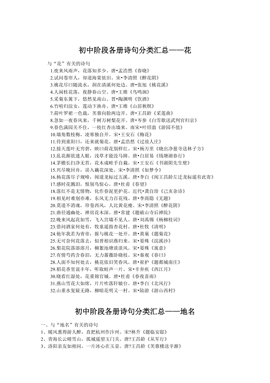 唐•李商隐《无题》20.莫道不消魂,帘卷西风,人比黄花瘦宋•李清照《醉花阴》21.曲径通幽处,禅房花木深唐•常建《题破山寺后禅院》22.晚来风起花如雪,飞入宫墙不见人唐•刘禹锡《杨柳枝词》23.借问酒家何处有,牧童遥指杏花村唐•杜牧《清明》24.他年我若为青帝,报与桃花一处开唐•黄巢《题菊花》25.无可奈何花落去,似曾相识燕归来宋•晏殊《浣溪沙》26.梨花院落溶溶月,柳絮池塘淡淡风宋•晏殊《寓意》27.有情芍药含春泪,无力蔷薇卧晓枝宋•秦观《春曰》28.人面不知何处去,桃花依旧笑春风唐•崔护《题都城南庄》29.稻花香里说丰年,听取蛙声一片宋•辛弃疾《西江月》30.晓看红湿处,花重锦官城唐•杜甫《春夜喜雨》31.燕山雪花大如席,片片吹落轩辕台唐•李白《北风行》32.山重水复疑无路,柳暗花明又一村宋•陆游《游山西村》初中阶段各册诗句分类汇总——地名一、与“地名”有关的诗句 1、暖风熏得游人醉,直把杭州作汴州宋?林升《题临安邸》 2、青海长云晴雪山,孤城遥望玉门关唐?王昌龄《从军行》 3、洛阳亲友如相问,一片冰心在玉壶唐?王昌龄《芙蓉楼送辛渐》 4、烟笼寒水月笼沙,夜泊秦淮近酒家。