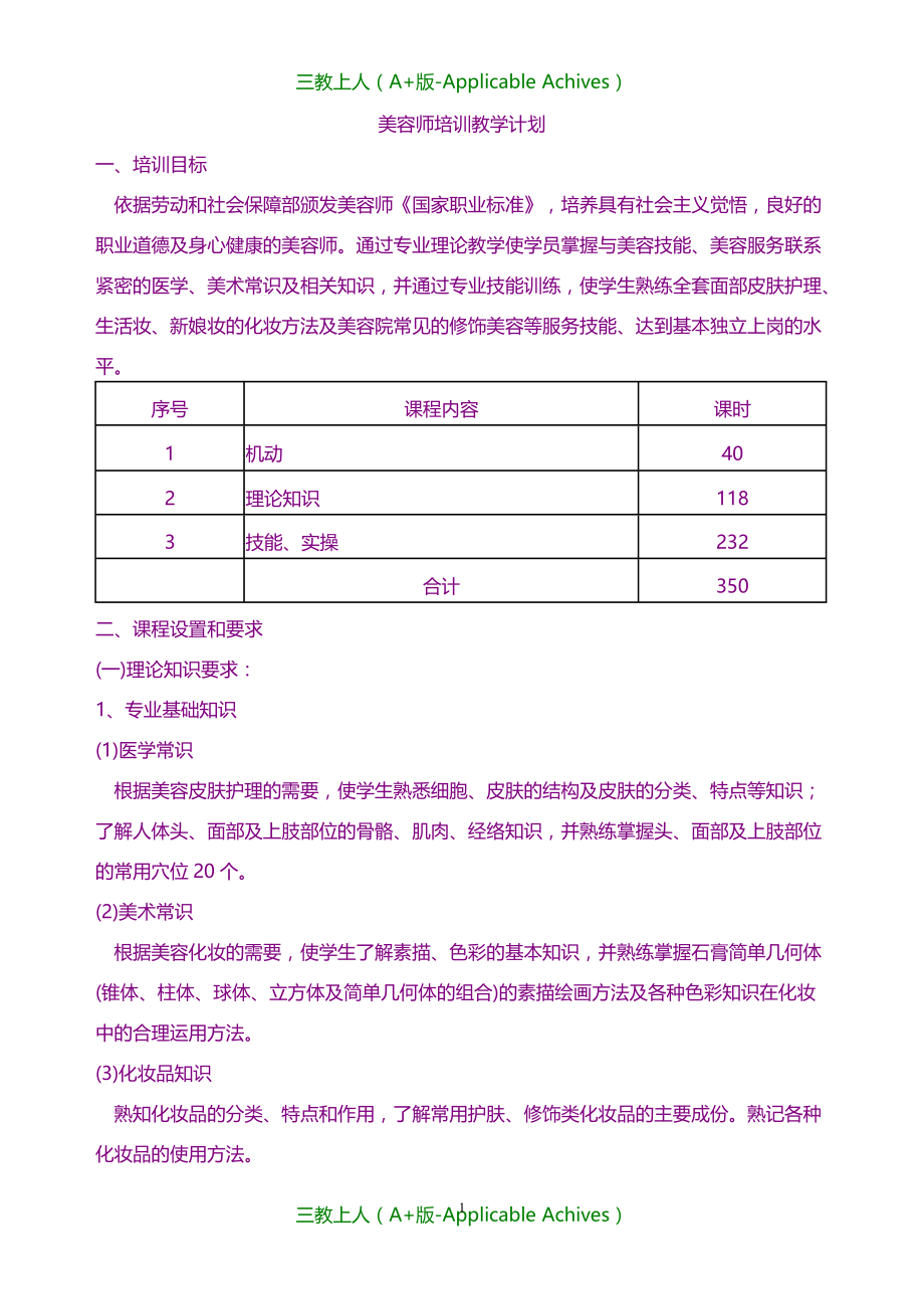 三教上人(A+版-Applicable Achives)美容师培训教学计划一、培训目标依据劳动和社会保障部颁发美容师《国家职业标准》,培养具有社会主义觉悟,良好的职业道德及身心健康的美容师通过专业理论教学使学员掌握与美容技能、美容服务联系紧密的医学、美术常识及相关知识,并通过专业技能训练,使学生熟练全套面部皮肤护理、生活妆、新娘妆的化妆方法及美容院常见的修饰美容等服务技能、达到基本独立上岗的水平序号课程内容课时1机动402理论知识1183技能、实操232合计350二、课程设置和要求(一)理论知识要求:1、专业基础知识(1)医学常识根据美容皮肤护理的需要,使学生熟悉细胞、皮肤的结构及皮肤的分类、特点等知识;了解人体头、面部及上肢部位的骨骼、肌肉、经络知识,并熟练掌握头、面部及上肢部位的常用穴位20个2)美术常识根据美容化妆的需要,使学生了解素描、色彩的基本知识,并熟练掌握石膏简单几何体(锥体、柱体、球体、立方体及简单几何体的组合)的素描绘画方法及各种色彩知识在化妆中的合理运用方法3)化妆品知识熟知化妆品的分类、特点和作用,了解常用护肤、修饰类化妆品的主要成份熟记各种化妆品的使用方法2、专业知识(4)美容仪器知识熟知与美容仪器操作相关的电学常识,安全用电常识及常用美容仪器的功能。