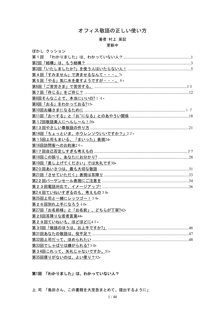 オフィス敬語の正しい使い方著者:村上 英記更新中ぼかし クッション 第1回 「わかりました」は、わかっていない人? 1第2回「結構」は、もう結構? 3第3回「いたしましたか?」を使う人はいたらない人! 5第4回「すみません」で済ませるなんて・・・ﻩ7第5回「やる」気に水を差すようですが・・・ﻩ8第6回「ご苦労さま」で苦労する 10第7回「存じる」をご存じ? 12第8回そんなことで、本当にいいの?ﻩ14第9回「おる」をわかっておる?ﻩ15第10回お嬢さまになるために 17第11回「お~する」と「お~になる」とのあやうい関係 18第12回敬語美人にへんし~ん!ﻩ20第13回やさしい尊敬語の作り方 21第14回「ちょっといま、ホウレンソウいいですか?」ﻩ22第15回上司もまいる、「まいった」表現ﻩ24第16回訪問客へのお約束ﻩ26第17回自己否定しすぎも考えもの 27第18回この誤り、あなたにお分かり? 28第19回「差し上げてください」では失礼ですﻩ30第20回あいさつは、最も大切な敬語 31第21回「させていただく」表現は耳障り 33第22回バーゲンセール表現にご注意を 34第23回電話対応で、イメージアップ! 36第24回ていねいすぎるのも、考えものﻩ38第25回上司と一緒にレッツゴー!ﻩ39第26回別れ上手になろうﻩ40第27回「お名前様」と「お名前」、どちらが丁寧?ﻩ42第28回耳障りな若者言葉ﻩ44第29回ていねいも、ほどほどにﻩ45第30回「敬語のほうは、お上手ですか?」 46第31回あなたの敬語は、役不足? 47第32回上司だって、ほめられたい 48第33回でしゃばりは嫌がられる?ﻩ50第34回これって、失礼じゃないですか。