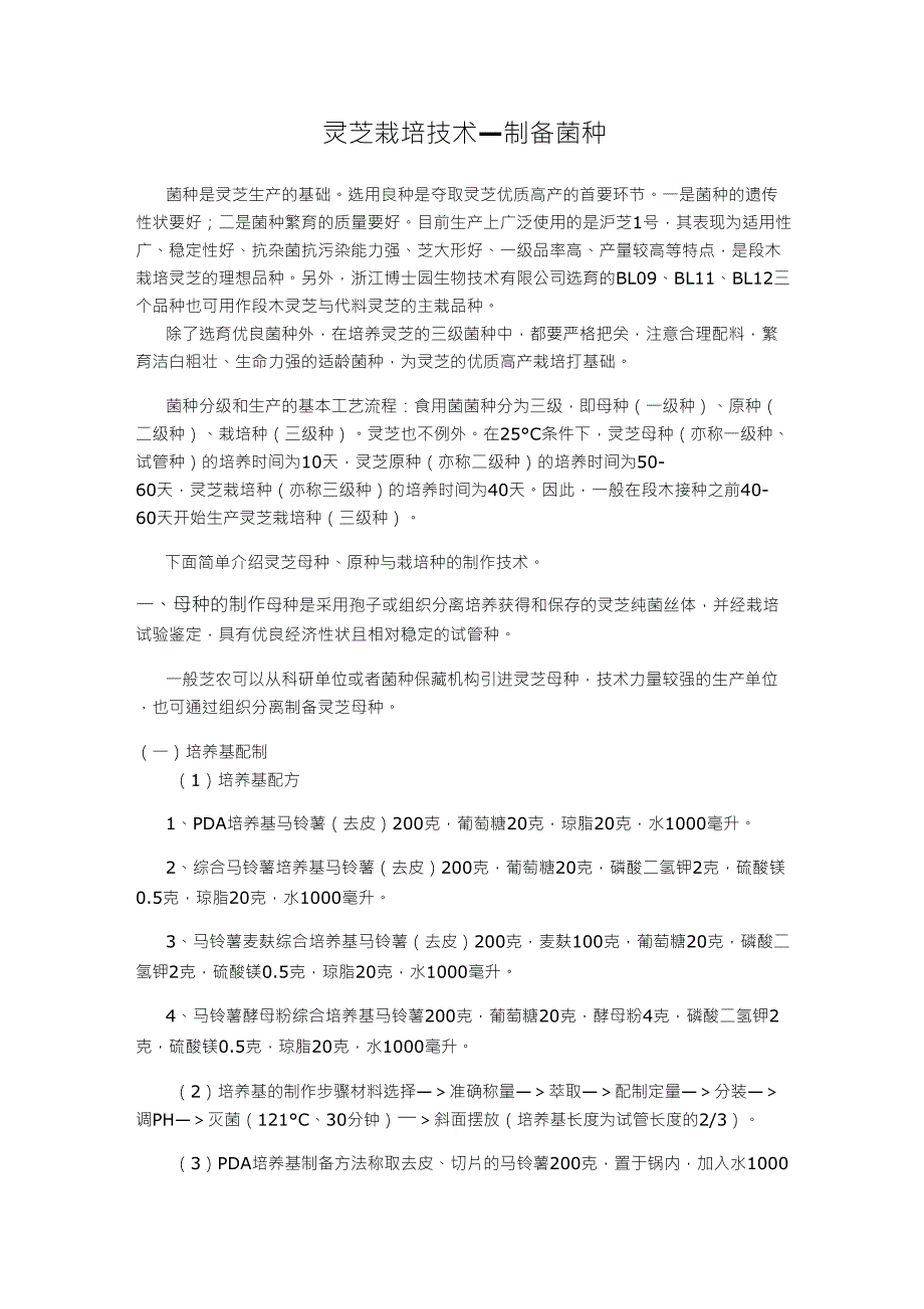 灵芝栽培技术—制备菌种菌种是灵芝生产的基础选用良种是夺取灵芝优质高产的首要环节一是菌种的遗传性状要好;二是菌种繁育的质量要好目前生产上广泛使用的是沪芝1号,其表现为适用性广、稳定性好、抗杂菌抗污染能力强、芝大形好、一级品率高、产量较高等特点,是段木栽培灵芝的理想品种另外,浙江博士园生物技术有限公司选育的BL09、BL11、BL12三个品种也可用作段木灵芝与代料灵芝的主栽品种除了选育优良菌种外,在培养灵芝的三级菌种中,都要严格把关,注意合理配料,繁育洁白粗壮、生命力强的适龄菌种,为灵芝的优质高产栽培打基础菌种分级和生产的基本工艺流程:食用菌菌种分为三级,即母种(一级种)、原种(二级种)、栽培种(三级种)灵芝也不例外在25°C条件下,灵芝母种(亦称一级种、试管种)的培养时间为10天,灵芝原种(亦称二级种)的培养时间为50-60天,灵芝栽培种(亦称三级种)的培养时间为40天因此,一般在段木接种之前40-60天开始生产灵芝栽培种(三级种)下面简单介绍灵芝母种、原种与栽培种的制作技术一、母种的制作母种是采用孢子或组织分离培养获得和保存的灵芝纯菌丝体,并经栽培试验鉴定,具有优良经济性状且相对稳定的试管种。