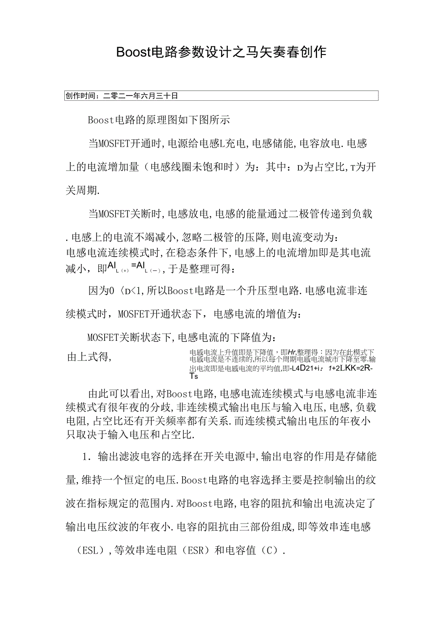 Boost电路参数设计之马矢奏春创作创作时间:二零二一年六月三十日Boost电路的原理图如下图所示当MOSFET开通时,电源给电感L充电,电感储能,电容放电.电感上的电流增加量(电感线圈未饱和时)为:其中:D为占空比,T为开关周期.当MOSFET关断时,电感放电,电感的能量通过二极管传递到负载.电感上的电流不竭减小,忽略二极管的压降,则电流变动为:电感电流连续模式时,在稳态条件下,电感上的电流增加即是其电流减小,即AIl(+)=AIl(一),于是整理可得:因为0〈D<1,所以Boost电路是一个升压型电路.电感电流非连续模式时,MOSFET开通状态下,电感电流的增值为:MOSFET关断状态下,电感电流的下降值为:电感电流上升值即是下降值,即Hr,整理得:因为在此模式下电感电流是不连续的,所以每个周期电感电流城市下降至零.输出电流即是电感电流的平均值,即-L4D21+i:1+2L由上式得,Kk=2R-Ts由此可以看出,对Boost电路,电感电流连续模式与电感电流非连续模式有很年夜的分歧,非连续模式输出电压与输入电压,电感,负载电阻,占空比还有开关频率都有关系.而连续模式输出电压的年夜小只取决于输入电压和占空比.1.输出滤波电容的选择在开关电源中,输出电容的作用是存储能量,维持一个恒定的电压.Boost电路的电容选择主要是控制输出的纹波在指标规定的范围内.对Boost电路,电容的阻抗和输出电流决定了输出电压纹波的年夜小.电容的阻抗由三部份组成,即等效串连电感(ESL),等效串连电阻(ESR)和电容值(C).在电感电流连续模式中,电容的年夜小取决于输出电流、开关频率和期望的输出纹波.在MOSFET开通时,输出滤波电容提供整个负载电流.在Boost电路中,为了满足期望的输出纹波电压,电容值可以按下式选取其中:【°max为最年夜的输出电流;Dmax为最年夜的占空比.对电感电流非连续模式,电容为在实际设计中,由于电容的ESR,为了保证较小的纹波电压,必需要选择更年夜容值的电容.在电感电流连续模式中,假设电容值足够年夜以至于可以忽略.就要有足够小的ESR来限制输出的电压纹波.在电感电流非连续模式下:纹波电流通过电容的ESR中会发生功率损耗,这个损耗会使电容内部的温度上升.过度的温升会年夜年夜缩短电容的使用寿命.在分歧的环境温度下,电容都有额定的纹波电流.通过电容的电流不能超越其额定值.通过输出电容电流的有效值为ESL可以通过选用低ESL的电容,限制引线线长度(PCB以及电容),和采纳多个小电容并联的形式来控制它的年夜小.有三种低阻抗的电容,铝、有机半导体和固体钽电容都适合于一般低本钱的商业领域.低阻抗铝电解电容本钱低,在较小的封装下可以提供更年夜的容量.但其ESR比力年夜.有机半导体电解电容在工业电源中用的越来越普遍.它可以提供较小的ESR和比力年夜的容量.固体钽电容可以提供低的ESR和ESL以及比力年夜的容量.在开关电源中是比力理想的选择.在开关电源中,电感的作用是存储能量.电感的作用是维持一个恒定的电流,或者说,是限制电感中电流的变动.在Boost电路中,选择合适电感量通经常使用来限制流过它的纹波电流.电感的纹波电流正比于输入电压和MOSFET开通时间,反比于电感量.电感量的年夜小决定了连续模式和非连续模式的工作点.除电感的感量外,选择电感还应注意它最年夜直流或者峰值电流,和最年夜的工作频率.电感电流超越了其额定电流或者工作频率超越了其最年夜工作频率,城市招致电感饱和及过热.瓷器件厂家提供了很多的电感都可用于DC/DC变换器.开关电源中最经常使用的磁心是铁氧体和电工铁.由于电感绕线的直流电阻,电流通过时发生电感铜损.同时,由于电感的交流电流会招致磁通交变,发生磁损.功率损耗会引起电感的温度上升,过度的温升会使导线的绝缘降低.Boost电路中,电感的损耗可以由下式计算,P=I2R+PinductorLcucore其中:Ru为绕线电阻;Pcore为磁损,可以有磁心厂家的数据手册中查到.在小功率的DC/DC变动中,PowerMOSFET是最经常使用的功率开关.MOSFET的本钱比力低,工作频率比力高.设计中选取MOSFET主要考虑到它的导通损耗和开关损耗.要求MOSFET要有足够低的导通电阻Rds(°n和比力低的栅极电荷Qg.MOSFET的耗散功率可以由下式计算,选择续流二极管的重要的标准是:开通速度、击穿电压、额定电流、正向导通电压.开关电源中,通常选择低正向导通电压的肖特基二极管.续流二极管的损耗计算:创作时间:二零二一年六月三十日。