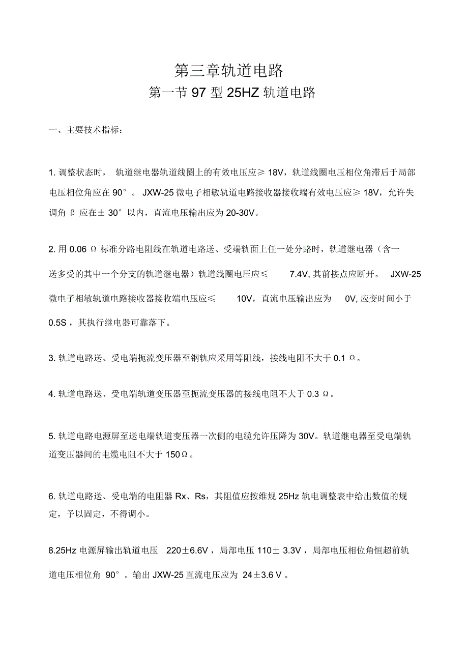 第三章轨道电路第一节 97 型 25HZ 轨道电路一、主要技术指标:1. 调整状态时, 轨道继电器轨道线圈上的有效电压应≥ 18V,轨道线圈电压相位角滞后于局部电压相位角应在 90° JXW-25微电子相敏轨道电路接收器接收端有效电压应≥ 18V,允许失调角β应在± 30°以内,直流电压输出应为 20-30V2. 用 0.06 Ω标准分路电阻线在轨道电路送、受端轨面上任一处分路时,轨道继电器(含一送多受的其中一个分支的轨道继电器)轨道线圈电压应≤ 7.4V, 其前接点应断开 JXW-25微电子相敏轨道电路接收器接收端电压应≤ 10V,直流电压输出应为 0V, 应变时间小于0.5S ,其执行继电器可靠落下3. 轨道电路送、受电端扼流变压器至钢轨应采用等阻线,接线电阻不大于0.1 Ω4. 轨道电路送、受电端轨道变压器至扼流变压器的接线电阻不大于0.3 Ω5. 轨道电路电源屏至送电端轨道变压器一次侧的电缆允许压降为 30V轨道继电器至受电端轨道变压器间的电缆电阻不大于 150Ω6. 轨道电路送、受电端的电阻器 Rx、Rs,其阻值应按维规 25Hz 轨电调整表中给出数值的规定,予以固定,不得调小。