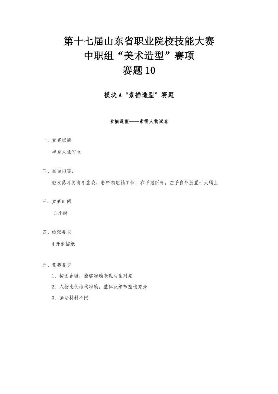 第十七届山东省职业院校技能大赛第十七届山东省职业院校技能大赛中职组“美术造型”赛项 中职组“美术造型”赛项 赛题 10赛题 10模块 A“素描造型”赛题模块 A“素描造型”赛题素描造型素描人物试卷素描造型素描人物试卷一、竞赛试题半身人像写生二、画面内容:短发露耳男青年坐姿,着带领短袖 T 恤,右手握纸杯,左手自然放置于大腿上三、竞赛时间3 小时四、纸张要求4 开素描纸五、竞赛要求1构图合理,能够准确表现写生对象2人物比例结构准确,整体及细节塑造充分3画法材料不限模块 A“色彩造型”赛题模块 A“色彩造型”赛题色彩造型色彩静物试卷色彩造型色彩静物试卷一、竞赛试题静物组合写生二、画面内容带耳带盖不锈钢小蒸锅 1 个(直径不大于 25CM)木铲子 1 个紫甘蓝半个、长青椒 2 个、洋葱 2 个玉米 1 个玻璃杯 1 个浅咖色麻料衬布 1 块、深蓝色衬布 1 块、白色衬布 1 块三、竞赛时间3 小时四、纸张要求4 开水粉纸或 4 开水彩纸五、竞赛要求1构图合理,能够准确表现写生对象2画面色调和谐,塑造充分,色彩关系正确3可用水粉或水彩表现模块 B“造型与装饰创作”赛题模块 B“造型与装饰创作”赛题造型与装饰创作图案与装饰试卷造型与装饰创作图案与装饰试卷一、竞赛试题根据提供的器皿照片,设计一幅装饰图形。