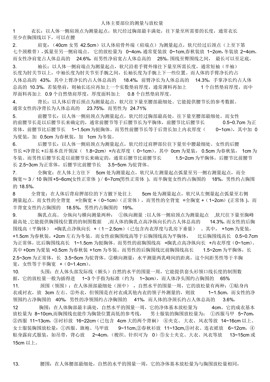 ②横向测量:水平测量两乳峰间的距离,这个间距男性等于半胸 宽,女性等于半胸宽 +(0~1.4cm) 10. 头围:在人体头部发际线(额头)自然的水平的围量一周,它能提供套头衫领口线长度的制图数 据,它的放松量一般为插得进1~3个手指为标准(约为1~3cm) ,而人体净头围约占胸围的65% 11. 颈围(领围):在人体颈部最细处(颈中) ,自然水平的围量一周,它的放松量有两种:①贴身内 衣或衬衣,放 3cm 左右②外衣,但领围是在衬衣或其他内衣的领子外测量的,则放1~1.5cm而女性的净 领围约占净胸围的40%,男性的净领围约占净胸围的41%,而人体的净颈长约占人体总高的3.6%12 胸围:在人体胸部最丰满处,自然水平的围量一周,它的净体基本放松量为4cm,它的成衣基本 放松量为 8~10cm,而胸围线也能作为胸袋位置高低的参考线,男士服装的胸围放松量为: ①西服马甲 5~7cm, ②西服 11~13cm,③衬衫放 16~22cm(已包含 4cm 大的两个背裥) ④夹克、大衣、风衣等放 14~16cm 以上女士服装胸围放松量:①西服、旗袍、马甲放9~11cm,②春秋衫放 11~13cm,③衬衣、连衣裙放6~12cm,④ 贴身露肩式服装,如吊带,背心放2~4cm。