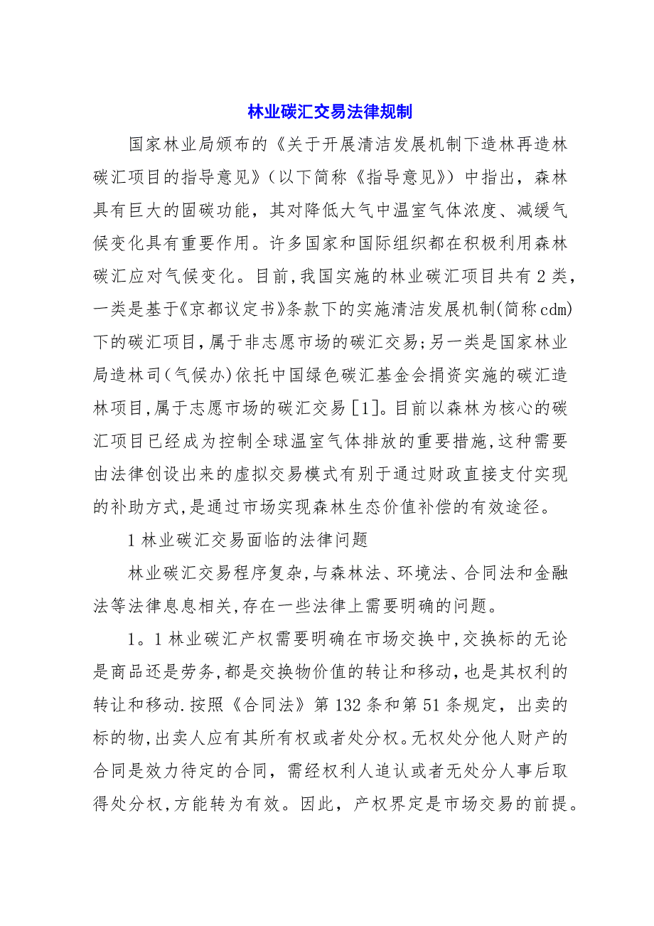 林业碳汇交易法律规制 国家林业局颁布的《关于开展清洁发展机制下造林再造林碳汇项目的指导意见》(以下简称《指导意见》)中指出,森林具有巨大的固碳功能,其对降低大气中温室气体浓度、减缓气候变化具有重要作用许多国家和国际组织都在积极利用森林碳汇应对气候变化目前,我国实施的林业碳汇项目共有2类,一类是基于《京都议定书》条款下的实施清洁发展机制(简称cdm)下的碳汇项目,属于非志愿市场的碳汇交易;另一类是国家林业局造林司(气候办)依托中国绿色碳汇基金会捐资实施的碳汇造林项目,属于志愿市场的碳汇交易[1]目前以森林为核心的碳汇项目已经成为控制全球温室气体排放的重要措施,这种需要由法律创设出来的虚拟交易模式有别于通过财政直接支付实现的补助方式,是通过市场实现森林生态价值补偿的有效途径 1林业碳汇交易面临的法律问题 林业碳汇交易程序复杂,与森林法、环境法、合同法和金融法等法律息息相关,存在一些法律上需要明确的问题 11林业碳汇产权需要明确在市场交换中,交换标的无论是商品还是劳务,都是交换物价值的转让和移动,也是其权利的转让和移动.按照《合同法》第132条和第51条规定,出卖的标的物,出卖人应有其所有权或者处分权。