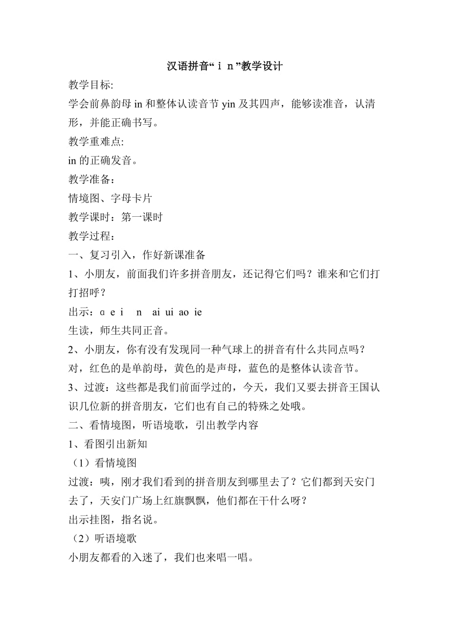 汉语拼音“in”教学设计 教学目标:学会前鼻韵母in和整体认读音节yin及其四声,能够读准音,认清形,并能正确书写教学重难点: in的正确发音教学准备:情境图、字母卡片教学课时:第一课时教学过程:一、复习引入,作好新课准备1、小朋友,前面我们许多拼音朋友,还记得它们吗?谁来和它们打打招呼? 出示:ɑ e i n ai ui ao ie 生读,师生共同正音2、小朋友,你有没有发现同一种气球上的拼音有什么共同点吗?对,红色的是单韵母,黄色的是声母,蓝色的是整体认读音节3、过渡:这些都是我们前面学过的,今天,我们又要去拼音王国认识几位新的拼音朋友,它们也有自己的特殊之处哦二、看情境图,听语境歌,引出教学内容1、看图引出新知(1)看情境图过渡:咦,刚才我们看到的拼音朋友到哪里去了?它们都到天安门去了,天安门广场上红旗飘飘,他们都在干什么呀?出示挂图,指名说2)听语境歌小朋友都看的入迷了,我们也来唱一唱出示:遥控器,摁一摁,荧屏映出天安门色彩鲜艳音乐美,小朋友越看越开心三、新授1、谈话儿歌读完,我们今天要学的三个韵母也出现了,请用你们的神眼睛瞧瞧它们,你发现了什么小问题?你们的眼睛真亮,这三个韵母后都有-n,这个-n,不是声母n,它只表示鼻音,发音时摆好发“n”的准备,舌尖顶住上腭的前部,让气流从鼻孔出来。