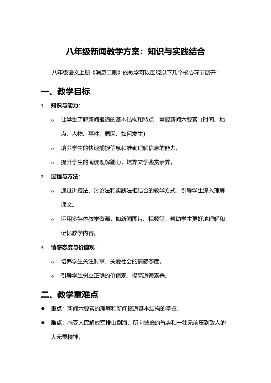 八年级新闻教学方案:知识与实践结合八年级语文上册《消息二则》的教学可以围绕以下几个核心环节展开:一、教学目标1. 知识与能力:o 让学生了解新闻报道的基本结构和特点,掌握新闻六要素(时间、地点、人物、事件、原因、如何发生)o 培养学生的快速捕捉信息和准确理解信息的能力o 提升学生的阅读理解能力,培养文学鉴赏素养2. 过程与方法:o 通过讲授法、讨论法和实践法相结合的教学方式,引导学生深入理解课文o 运用多媒体教学资源,如新闻图片、视频等,帮助学生更好地理解和记忆教学内容3. 情感态度与价值观:o 培养学生关注时事、关爱社会的情感态度o 引导学生树立正确的价值观,提高道德素养二、教学重难点l 重点:新闻六要素的理解和新闻报道基本结构的掌握l 难点:感受人民解放军排山倒海、所向披靡的气势和一往无前压到敌人的大无畏精神三、教学过程1. 导入新课(约5分钟):o 可以通过展示新闻图片或播放相关纪录片片段,引导学生关注新闻,为新课学习做好铺垫o 提问:“你们平时喜欢看新闻吗?你们觉得新闻对我们的生活和成长有什么作用?”以激发学生的学习兴趣2. 讲解课文(约10分钟):o 介绍《消息二则》的作者、背景和内容梗概。