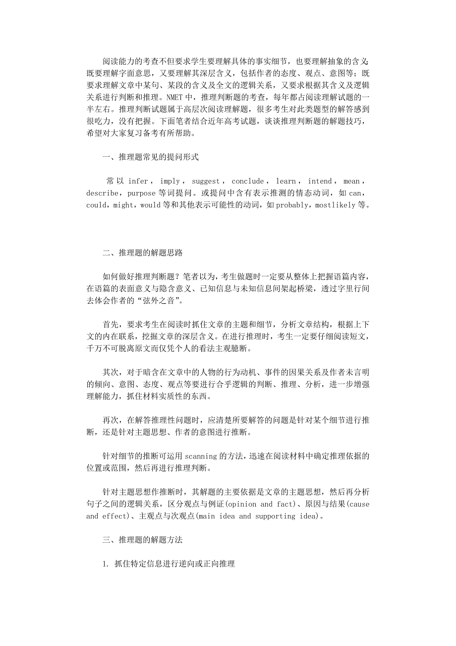 阅读能力的考查不但要求学生要理解具体的事实细节,也要理解抽象的含义;既要理解字面意思,又要理解其深层含义,包括作者的态度、观点、意图等;既要求理解文章中某句、某段的含义及全文的逻辑关系,又要求根据其含义及逻辑关系进行判断和推理NMET中,推理判断题的考查,每年都占阅读理解试题的一半左右推理判断试题属于高层次阅读理解题,很多考生对此类题型的解答感到很吃力,没有把握下面笔者结合近年高考试题,谈谈推理判断题的解题技巧,希望对大家复习备考有所帮助 一、推理题常见的提问形式 常以infer,imply,suggest,conclude,learn,intend,mean,describe,purpose等词提问或提问中含有表示推测的情态动词,如can,could,might,would等和其他表示可能性的动词,如probably,most likely等 二、推理题的解题思路 如何做好推理判断题?笔者以为,考生做题时一定要从整体上把握语篇内容,在语篇的表面意义与隐含意义、已知信息与未知信息间架起桥梁,透过字里行间去体会作者的“弦外之音” 首先,要求考生在阅读时抓住文章的主题和细节,分析文章结构,根据上下文的内在联系,挖掘文章的深层含义。